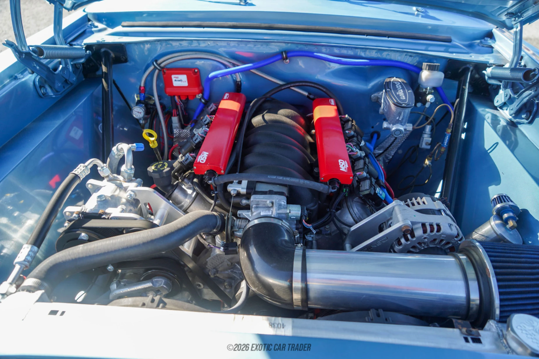 At a glance, the Marina Blue exterior looks clean and understated, but closer inspection reveals extensive custom metalwork throughout. The body has been fully shaved, with trim, emblems, door handles, trunk lock, and fuel door removed and smoothed, creating a sleek, uninterrupted profile. Doors and trunk operate by remote, the rear wheel openings have been subtly enlarged to accommodate larger wheels, and the color-matched bumpers have been smoothed and tucked tighter to the body. A cowl hood, HID headlights, a discreet front chin spoiler, and a dark blue power convertible top with a chrome-plated frame complete the refined yet aggressive look. Inside, the cabin has been fully gutted and rebuilt with sound deadening, power windows, a smoothed metal dash, Dakota Digital gauges, and neatly integrated air conditioning controls. Procar sport bucket seats, a custom center console, tilt steering column, and a high-end Rockford Fosgate audio system create a modern, comfortable interior while retaining the classic Nova layout.