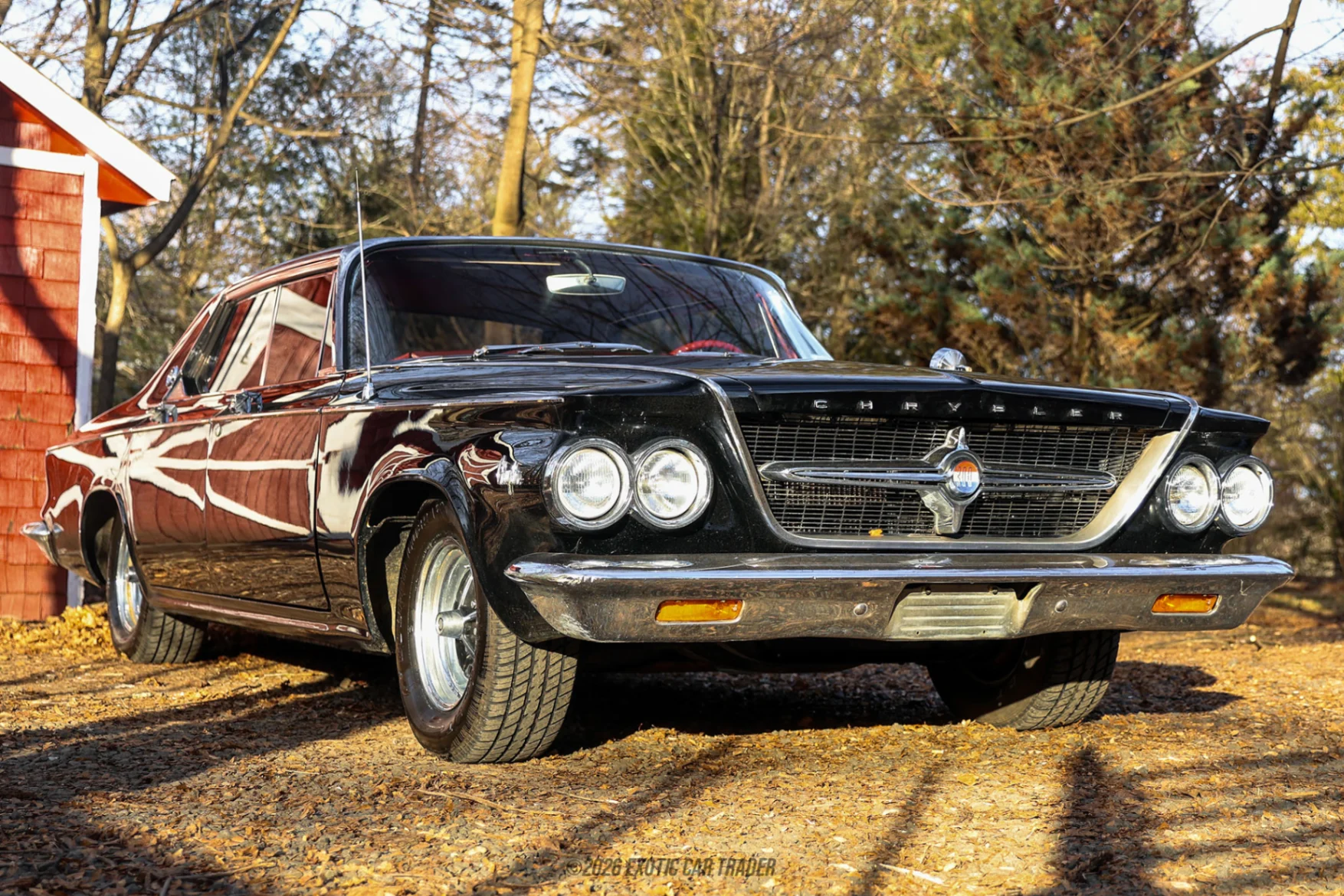 The exterior of this 1963 Chrysler 300 presents a formal yet restrained design, defined by a long hood, subtle chrome accents, and Chrysler’s distinctive grille and quad headlamp arrangement. The black finish highlights the car’s straight body lines and understated presence, while factory-correct styled steel wheels reinforce its period authenticity. Inside, the red interior provides a striking contrast and reflects Chrysler’s early-1960s approach to luxury, featuring wide bench seating, expansive glass, and a horizontal dashboard layout. The cabin includes original-style trim, a factory all-transistor AM radio, and a rear speaker, emphasizing comfort, space, and a cohesive factory presentation.