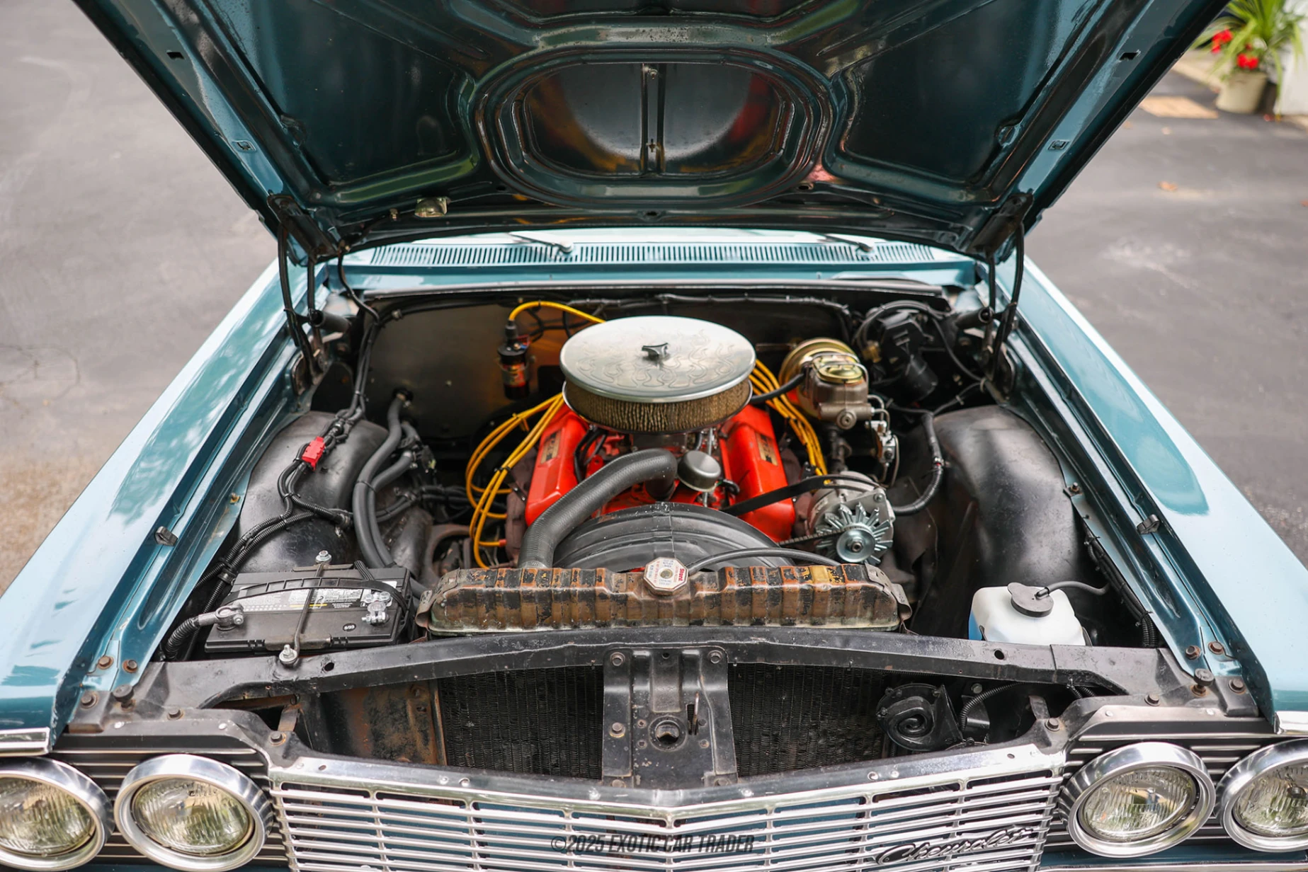 Under the hood lies a 327ci V8 engine, enhanced with an updated Holley carburetor for improved performance and reliability. Power is delivered through an automatic transmission, providing smooth shifts and ease of use. Supporting upgrades such as the new wiring harness, new heater system, and front disc brakes ensure the Impala is not only stylish but also road-ready. Underneath, an updated stainless steel exhaust system adds a subtle performance edge.
