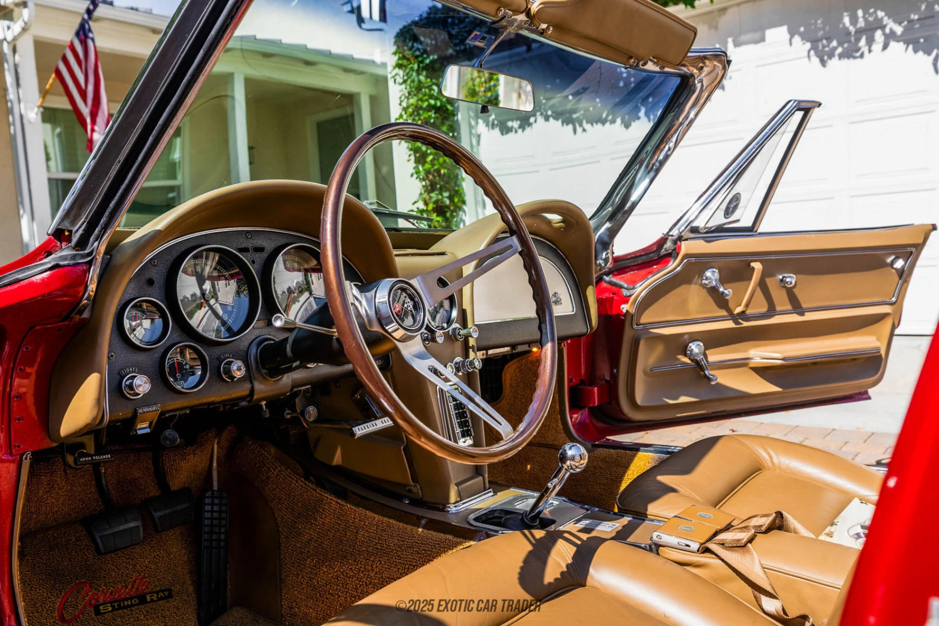 This 1965 Chevrolet Corvette Convertible sits pretty in a Marlboro Red dress, and rolls on a set of meaty BFGoodrich red-striped tires wrapped around chrome hub caps on steel wheels. The car’s sleek styling is the work of Larry Shinoda, and, when paired with its captivating dual pop-up headlamps, really makes for a vehicle that turns heads. Even those who alight from supercars will stop and glance at this symbol of timeless American beauty and class. Chrome bumpers and twin chromed exhaust tips add some glitz and glamour to the car’s overall mien without appearing garish or vulgar. This is how a timeless class should look. The interior of this 1965 Chevrolet Corvette Convertible comes in beige and brown. It features that iconic twin-cowled dashboard that would set a foundation for the Corvette for generations to come. With its large analog dials and interesting vertically oriented radio, this car is definitely one that you’ll want to spend plenty of time behind the wheel. And thanks to its sizable trunk, you can do just that. Want to cross the country? Yes, you can.