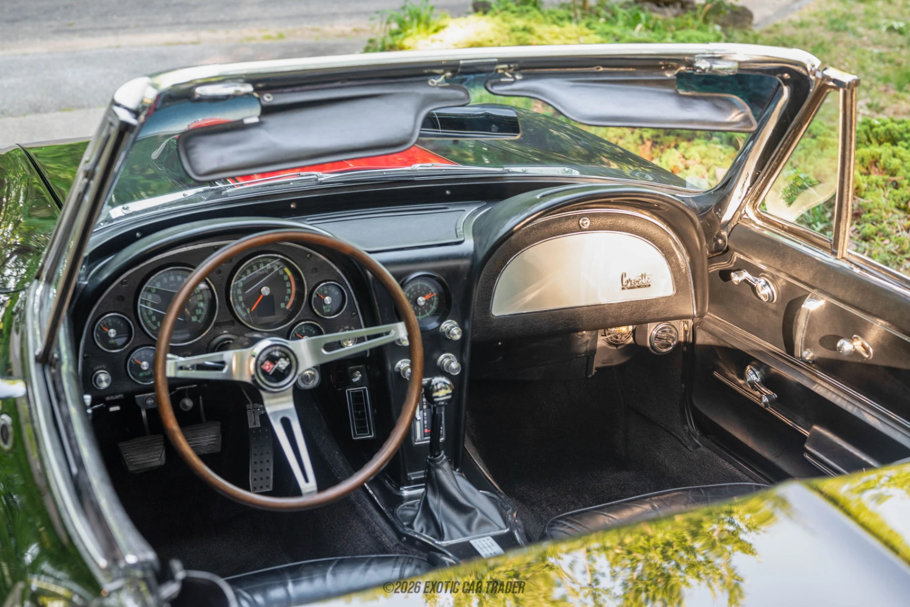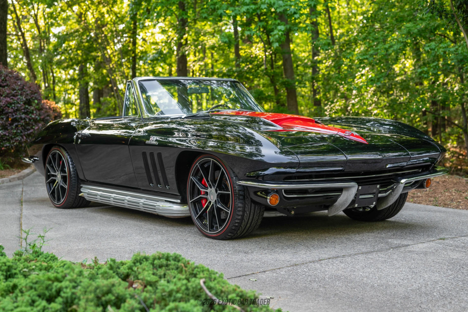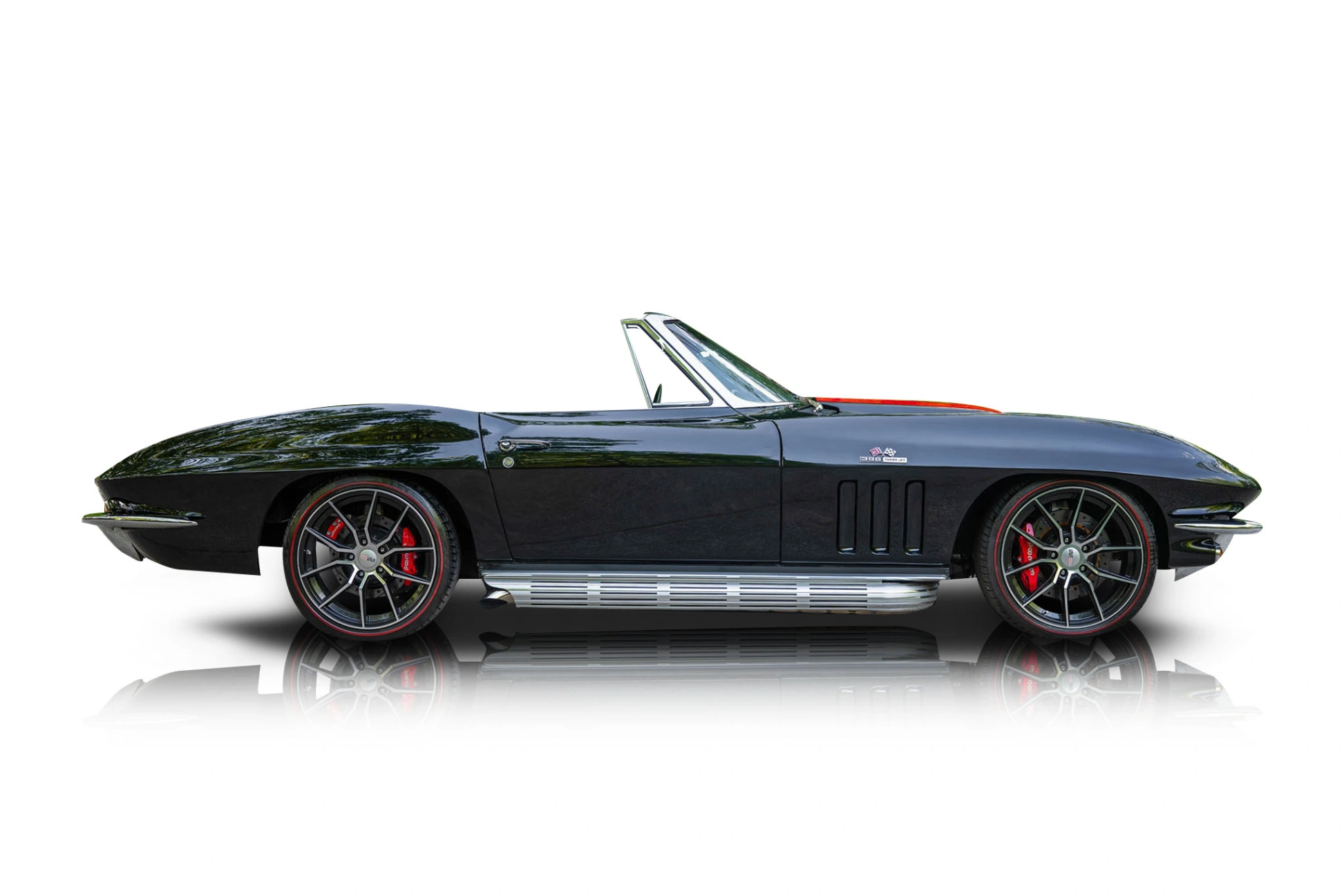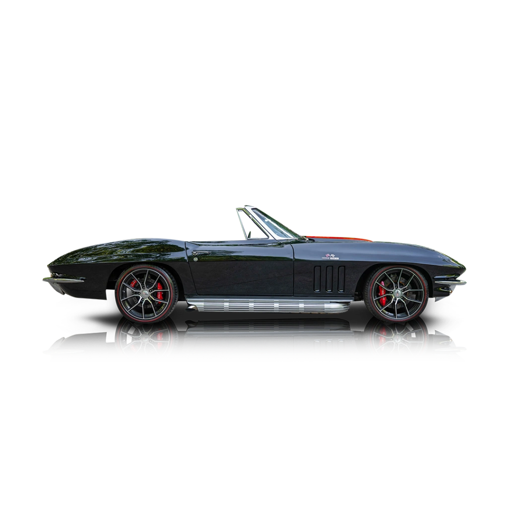 The exterior of this 1965 Chevrolet Corvette Convertible Restomod is finished in sleek black, perfectly complementing the sculpted lines of the C2 body. A signature stinger hood with a red stripe adds a bold visual accent, while side pipe exhaust reinforces its classic performance identity with both style and sound. The car sits on spider-style wheels that maintain a period-correct appearance while enhancing its stance. A black convertible soft top completes the look, allowing for open-air enjoyment while preserving the car’s cohesive aesthetic. The interior of this 1965 Chevrolet Corvette Convertible Restomod continues the all-black theme, offering a clean and driver-focused environment. Modern amenities such as air conditioning improve comfort, making the car more usable in a variety of climates, while a RetroSound audio system with Bluetooth connectivity adds contemporary convenience without disrupting the vintage feel. The cabin strikes a balance between originality and modernization, ensuring that the driving experience remains engaging yet comfortable.