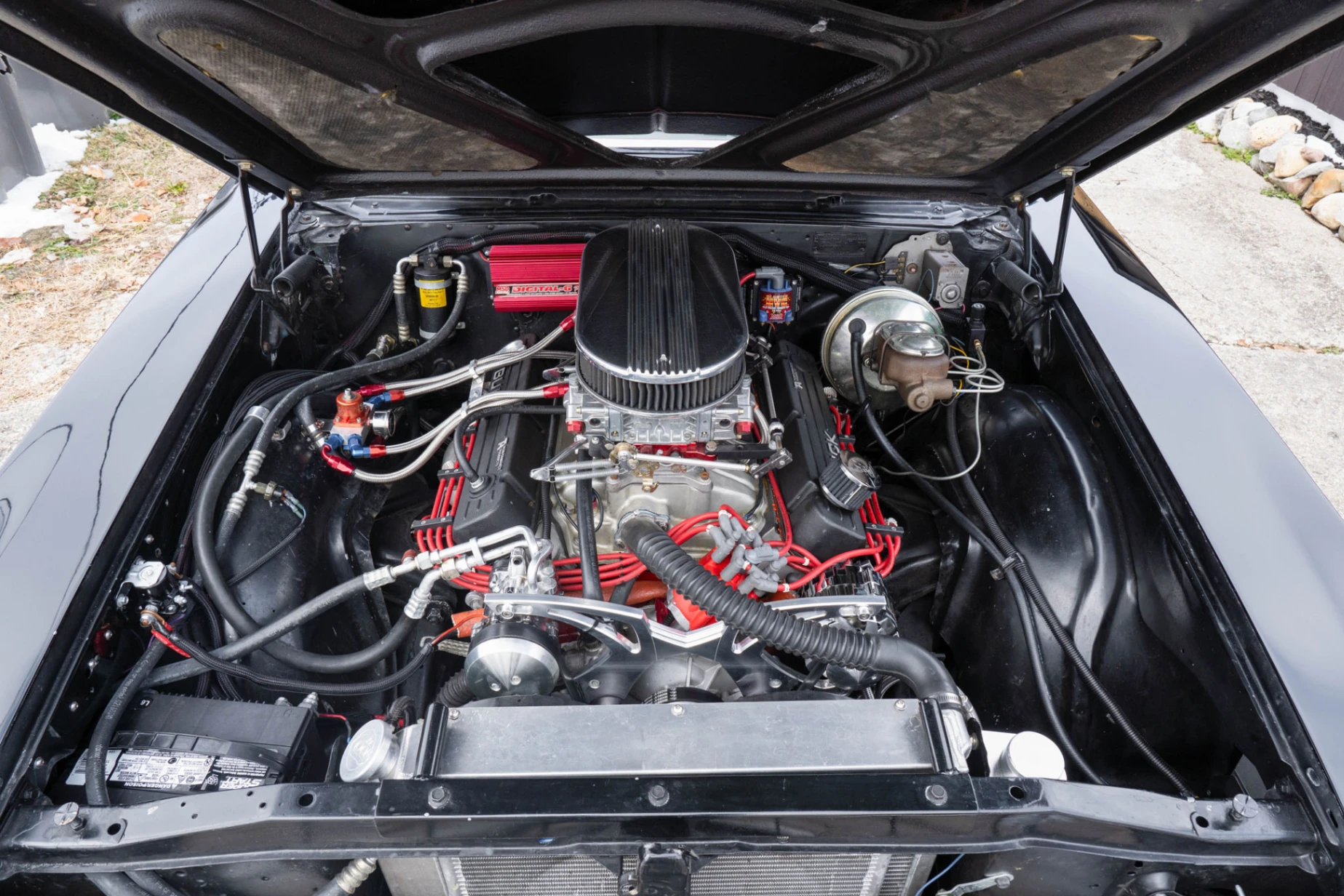 A 494ci V8 powers this 1966 Buick Skylark GS, paired with a Buick T-56 6-speed manual transmission. Power goes to the rear wheels through a Ford 9-inch rear end. The engine inhales through dual 4-barrel carbs, and expels spent gases with suitably veracity via big tube headers, a new 3-inch exhaust system and a Flowmaster H-pipe. You’ve also got TA aluminum heads, MSD ignition, Eagle H-beam rods and J&E forged pistons. Elsewhere, there’s four-wheel disc brakes to suitably rein in the upgraded power – because like the old Pirelli slogan, power is nothing without control. And in control you must be, with this car!