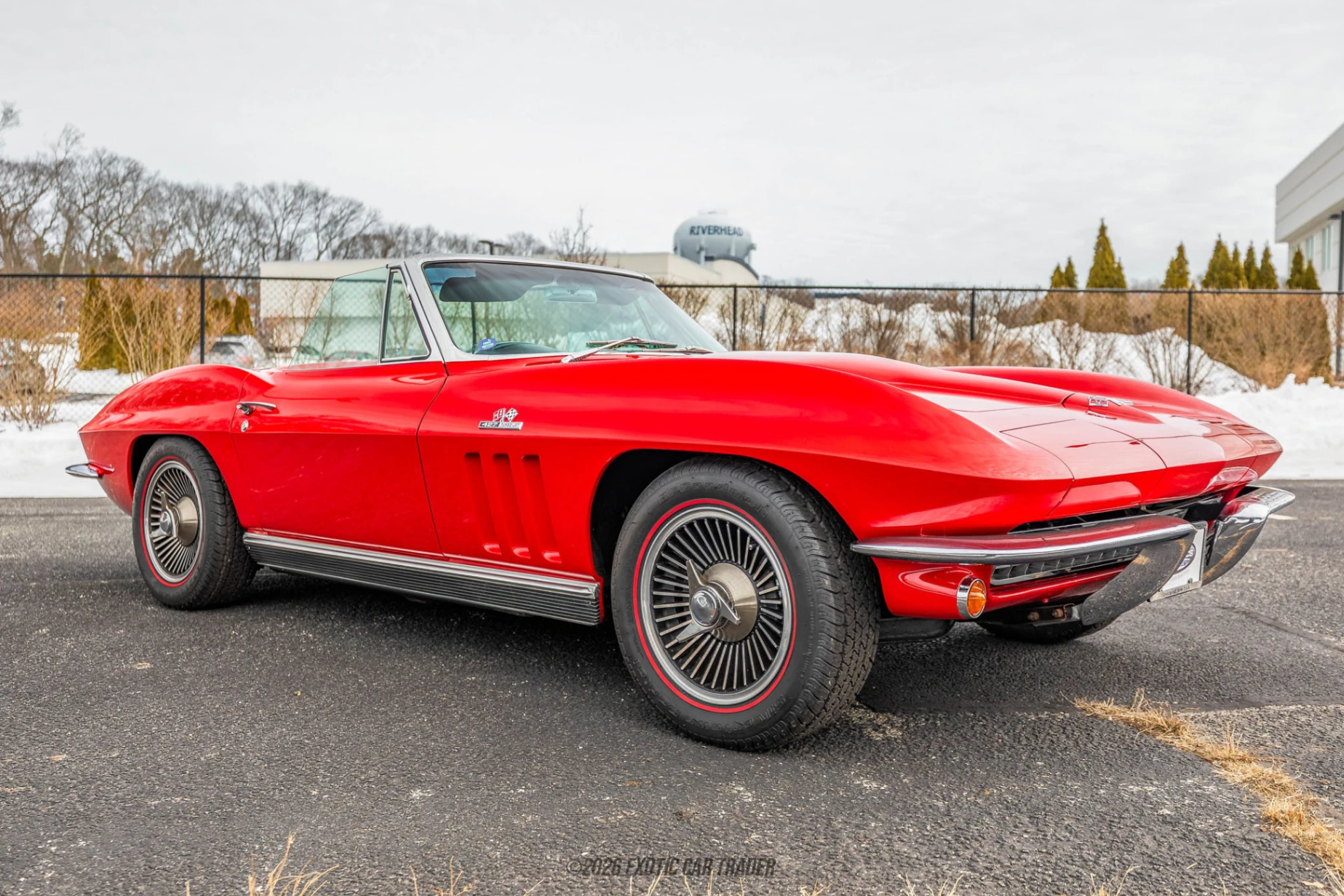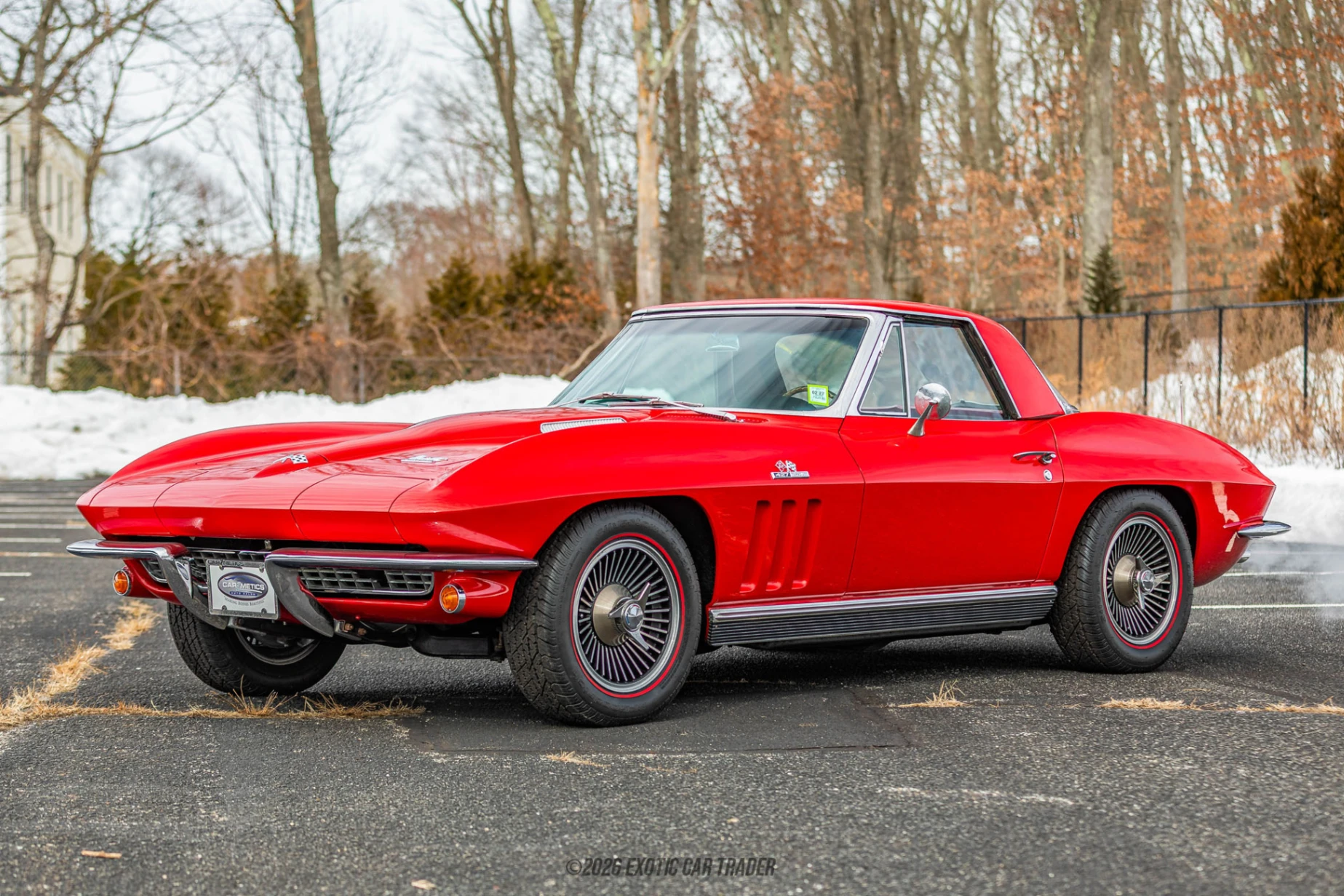 The exterior of this 1966 Chevrolet Corvette Sting Ray Coupe is finished in Rally Red, a bold and period-correct color that highlights the sculpted fenders and muscular proportions of the C2 body. The 1966 model year features the distinctive eggcrate grille and clean rear styling without the split window of earlier models. Turbine-style knock-off wheels paired with redline tires reinforce its authentic mid-1960s appearance, while factory-style side exhaust adds both visual drama and the unmistakable big-block soundtrack. Chrome bumpers, crisp body lines, and the iconic fender vents complete the timeless design. The interior of this 1966 Chevrolet Corvette Sting Ray Coupe is trimmed in Black vinyl and maintains a classic driver-focused layout. The wood-rim steering wheel frames a full gauge cluster including tachometer and auxiliary gauges angled toward the driver, emphasizing performance intent. The 4-speed manual shifter rises from the center console, reminding you that this Corvette was built for engagement. Simple, purposeful, and unmistakably 1960s, the cabin reflects the era when driving feel took priority over luxury excess.