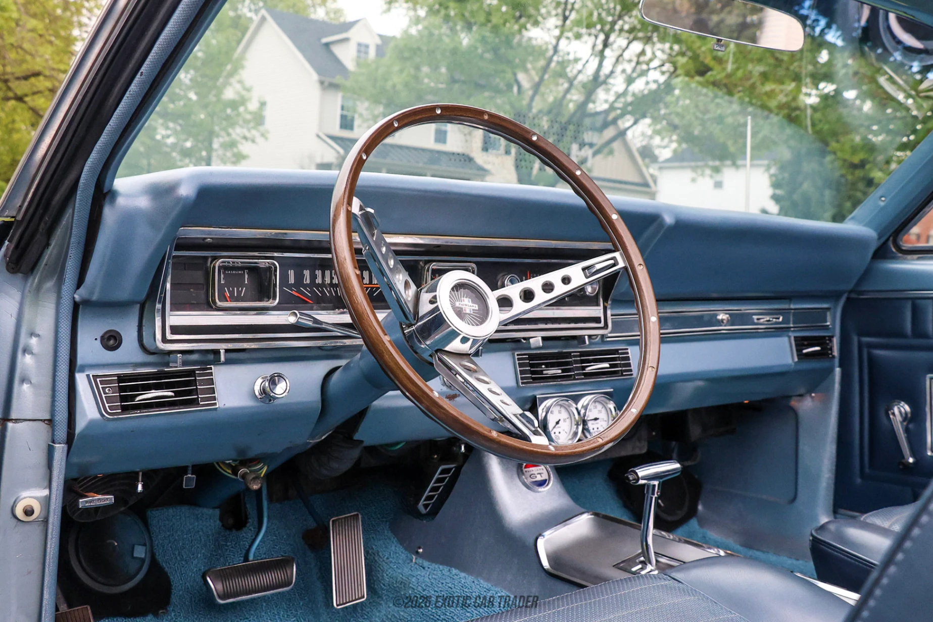 The exterior of this 1966 Ford Fairlane 500 Convertible is finished in light blue metallic, a period-correct shade that highlights the car’s clean body lines and chrome detailing. The white power convertible soft top provides a crisp contrast and allows for easy top-down driving. Chrome exhaust extensions and classic trim elements maintain its vintage charm, while GT-style wheels subtly hint at its performance roots. The overall presentation strikes a balance between originality and tasteful enhancement, making it equally suitable for shows or weekend drives. The interior of this 1966 Ford Fairlane 500 Convertible is finished in blue, offering a cohesive and inviting cabin. Bucket seats provide improved comfort and a sportier feel compared to a traditional bench setup, while the simulated wood steering wheel adds a touch of classic sophistication. Auxiliary gauges have been integrated to provide additional engine monitoring, and the addition of aftermarket air conditioning makes the car far more enjoyable in warmer climates. An Alpine head unit paired with an upgraded sound system introduces modern audio capability while preserving the vintage ambiance.