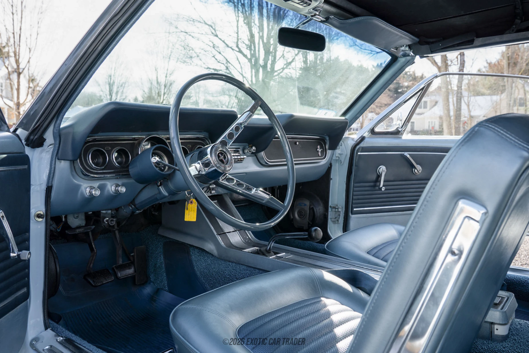 Light Blue paint adorns this 1966 Ford Mustang Convertible and it’s a very Sixties shade. Pastel hues of blue, green, yellow and even pink were the colors of the day, as moods were happy and worries were minimal in comparison to today. This car features an aftermarket convertible top in contrasting beige, and rides on a set of 14-inch styled steel wheels wearing whitewall radial tires for that period-correct look. It’s also got the requisite 289 and Mustang pony badges, plus chrome bumpers. The blue interior of this 1966 Ford Mustang Convertible matches with its exterior and can seat four adults with ease. It’s a lovely place to go cruising in, with a push-button radio, slider controls for the heater, and nary a digital device in sight. Pop the trunk and you’ve also got some decent space for your luggage if it’s a multi-day trip you’re embarking on.