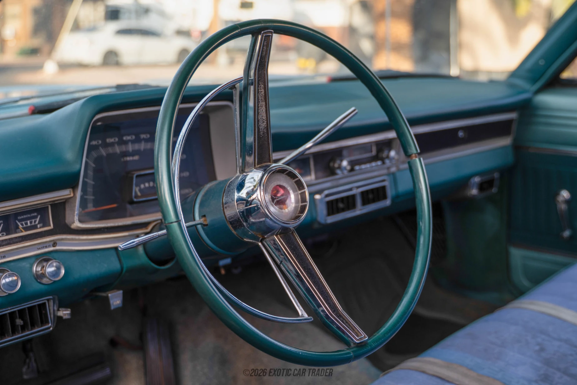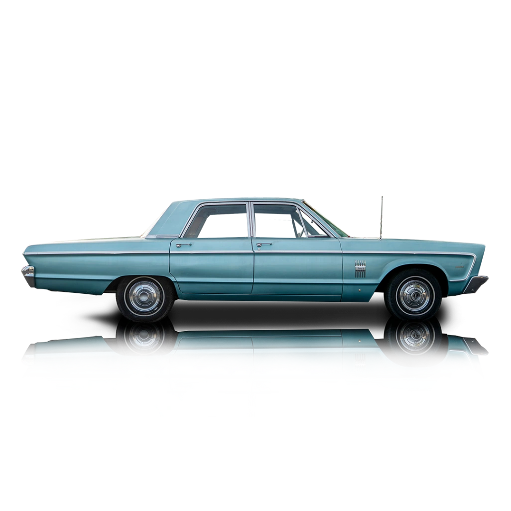This 1966 Plymouth Fury comes in light blue and showcases the vertically stacked headlamp design that came for the fourth generation of the Fury. It’s an interesting face, with a slimline chrome grille spanning the tall headlamp clusters, bisected by a Fury III badge at the front. The side profile shows off the length of the car, with its four-door design and white-striped tires on full-size chromed hubcaps. At the rear, we’ve got four red taillamps and a design that mirrors the front grille. Overall, it’s a bit different to your typical Ford or Chevy full-size Sixties sedan, which is why we think you’ll really enjoy owning and driving this car. The blue interior of this 1966 Plymouth Fury sports front and rear bench seats, a tilt steering wheel, and even air conditioning to keep you comfortable regardless of the weather. It’s also got a dished steering wheel, a push-button radio and lap belts for occupant safety. Popping the trunk reveals a suitably large load space as well as the spare tire and some literature pertaining to the car.