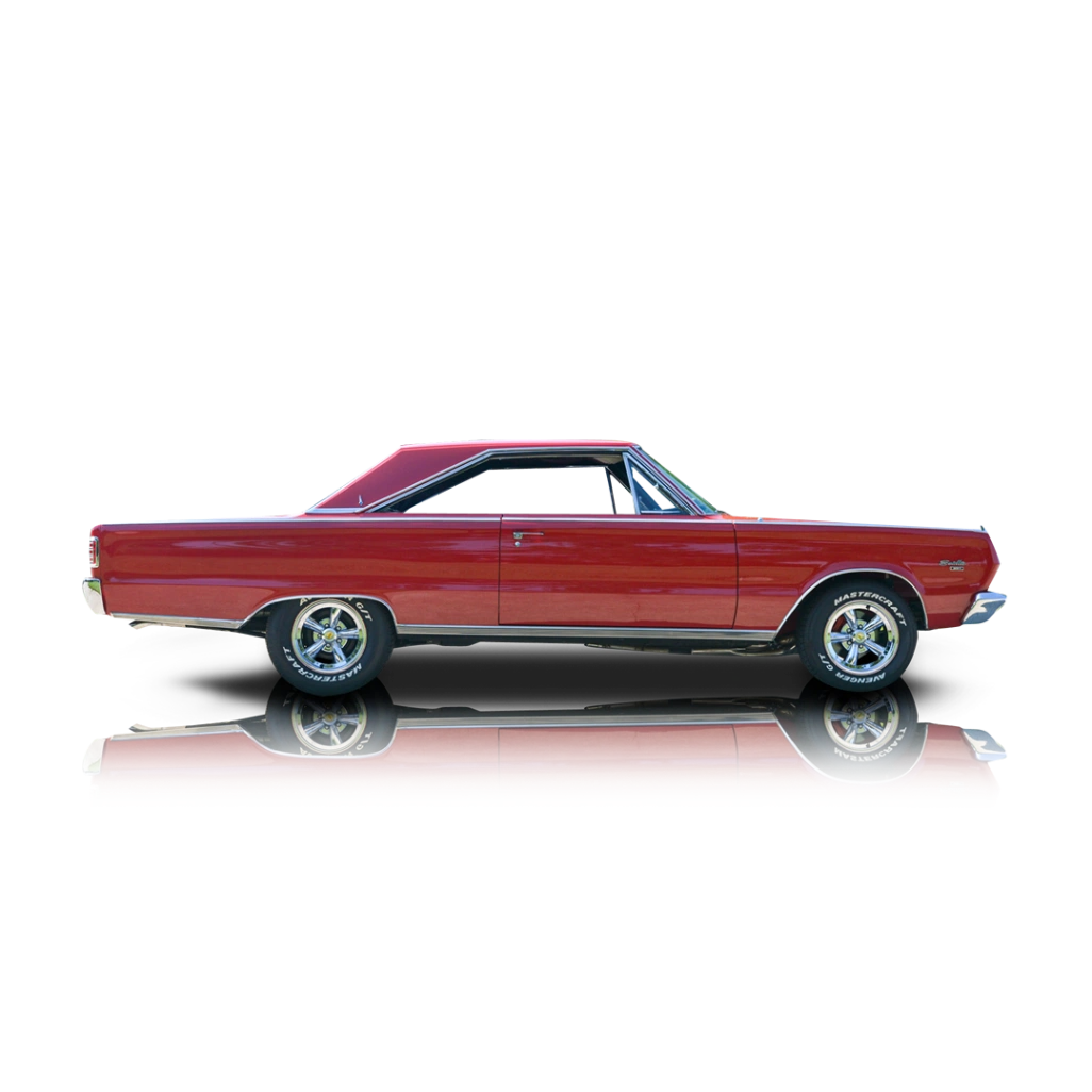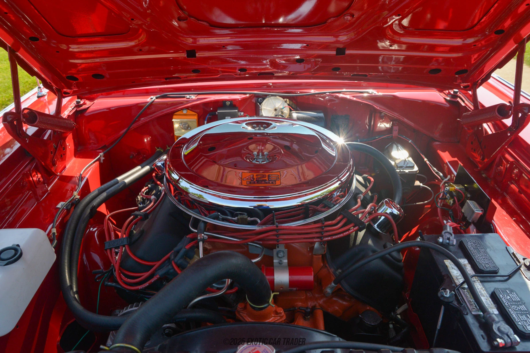 The exterior, finished in vivid red, showcases sharp body lines and period-correct HP2 badging, a subtle but important indicator of its factory HEMI heritage. Chrome accents, polished trim, and the aggressive stance on period-style wheels complete the look of a true 1960s street machine. Inside, the black interior offers a driver-focused layout with classic instrumentation, a floor-mounted 4-speed shifter, and restored trim throughout. Every element reflects careful attention to originality and period accuracy during the restoration process.