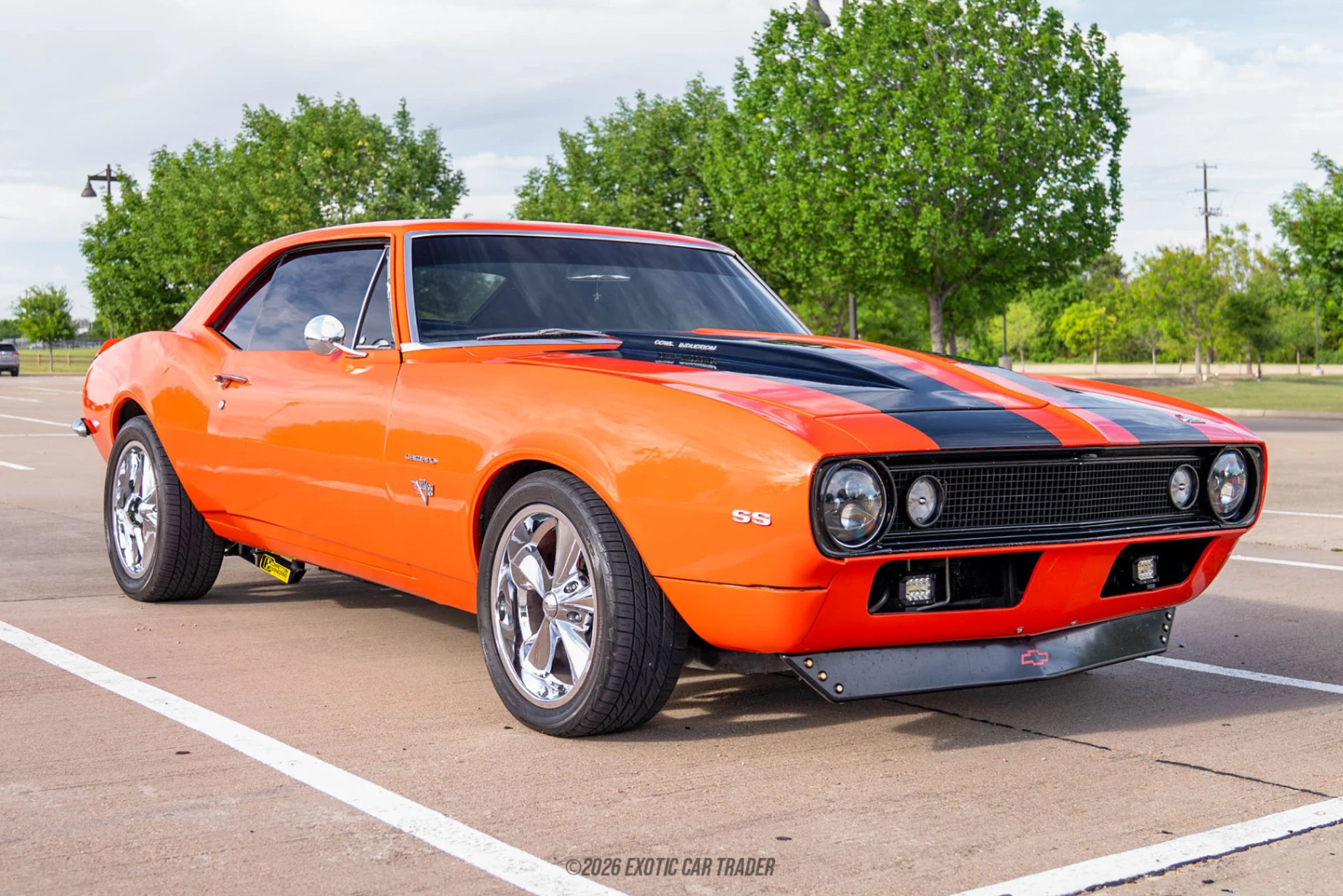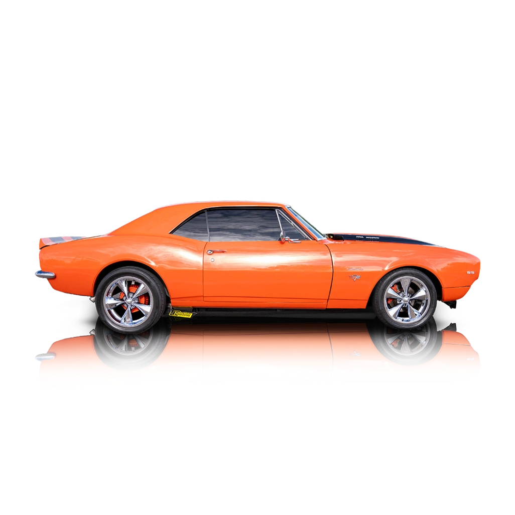 The exterior of this 1967 Chevrolet Camaro is finished in vibrant Hugger Orange, complemented by dual black rally stripes that emphasize its aggressive, performance-oriented look. A cowl induction hood adds both visual impact and functional inspiration, while SS badging reinforces its muscle car identity. The car sits on aftermarket wheels that give it a slightly modernized stance without straying too far from its classic roots. Clean lines and iconic proportions make this first-generation Camaro instantly recognizable and highly desirable. The interior of this 1967 Chevrolet Camaro features a clean black cabin that remains true to the car’s original simplicity while incorporating tasteful upgrades. An aftermarket steering wheel and floor shifter enhance driver engagement, while auxiliary gauges provide additional engine monitoring for performance driving. A Pioneer head unit and upgraded audio system bring modern convenience into the mix without overwhelming the vintage feel. The overall layout is straightforward and functional, offering a balanced blend of classic muscle car character and usability.