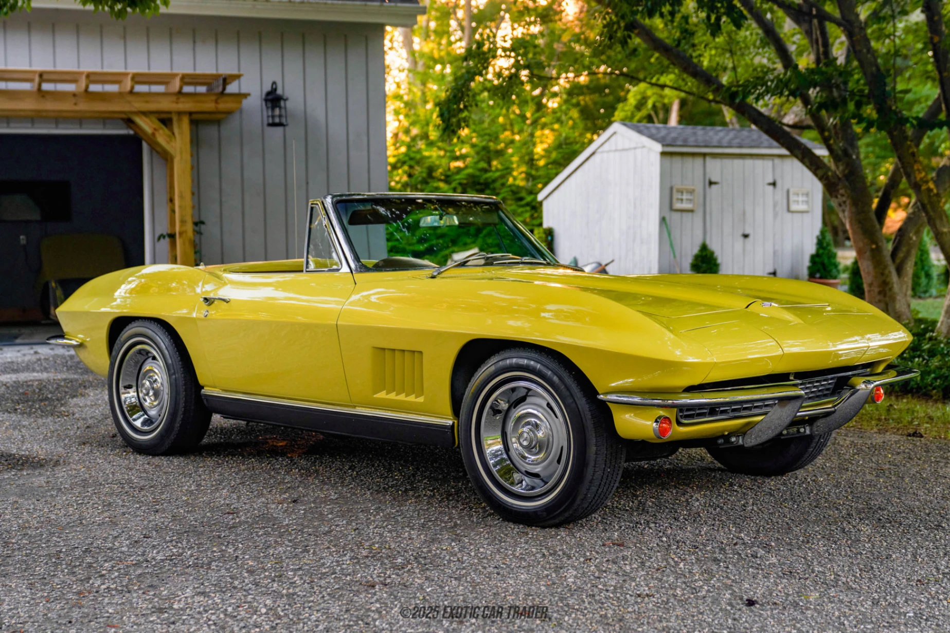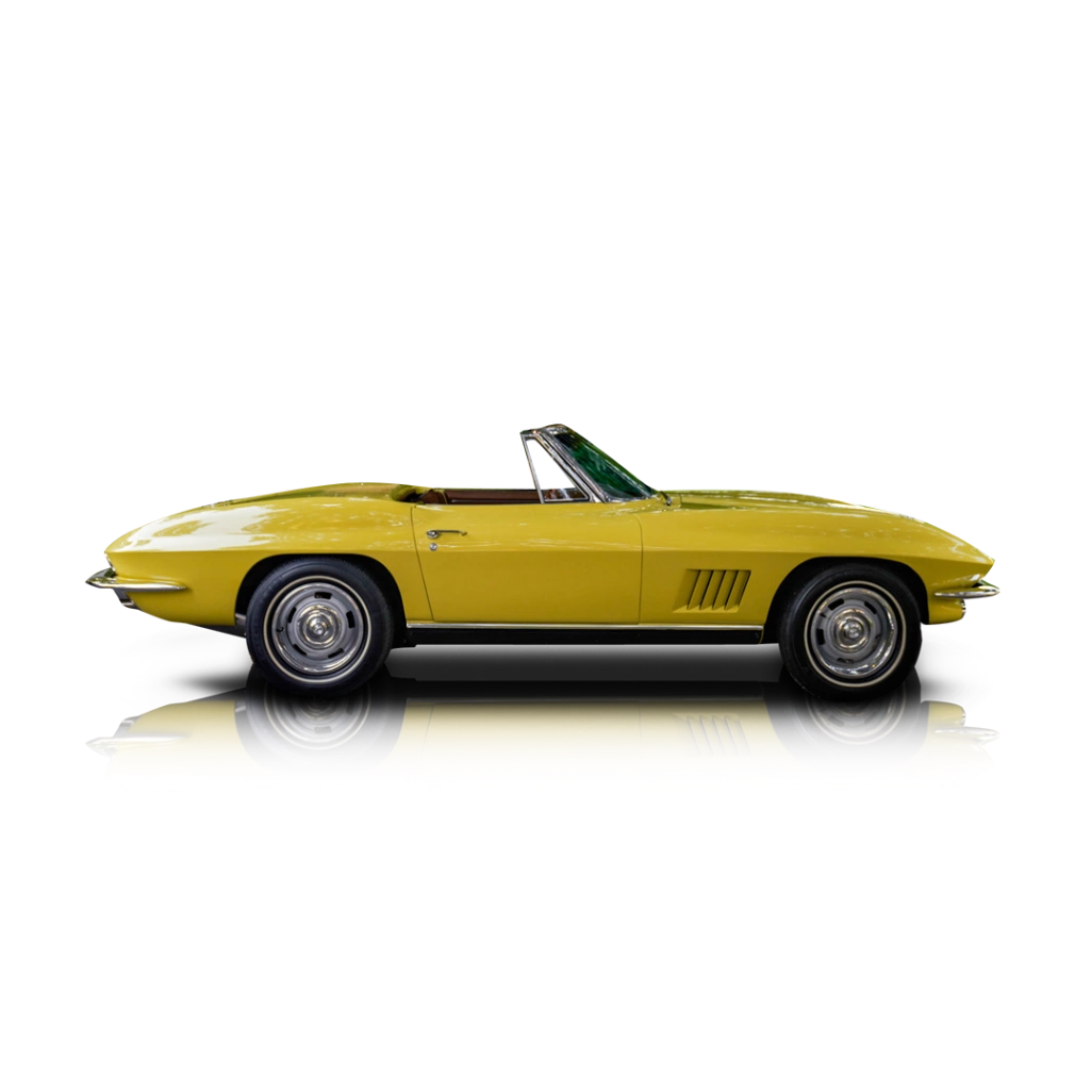 With its yellow coat of paint and tan cloth top, this 1967 Chevrolet Corvette Convertible is definitely a car for the sunshine and blue skies. However, it’s still a treat to drive even if the weather is less than brilliant. Its pop-up headlamps, boat-tailed styling and distinctive stance are all features that will not only lift up your spirits, but those of everyone within eyesight and earshot of this beautiful American classic. After all, who doesn’t love a Corvette? Inside, you’ll be treated to a gorgeous brown interior with leather-upholstered seats, a wood-rimmed steering wheel, and more. You can also clearly see the twin-cowled dashboard design that the C2 is famous for. Another 1967 feature, which this 1967 Chevrolet Corvette Convertible clearly has, is the center console-mounted hand brake lever, which was located beneath the dash on cars from earlier years. Oh, and if you’re wondering how to access the trunk, it’s done by tilting the seat backs forward. You see, Chevy’s designers didn’t want to spoil the clean lines of the car, so the lack of a trunk lid is a small sacrifice to make.