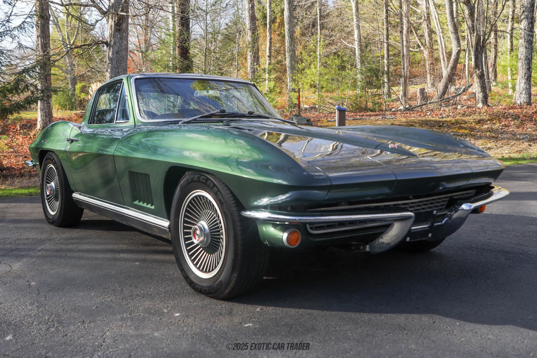 The exterior showcases the deep Goodwood Green paintwork contrasted by crisp chrome bumpers, fender louvers, and the elegant fastback silhouette that defines the ’67 Sting Ray. It rides on reproduction 1967 turbine-style bolt-on aluminum wheels wrapped in Goodyear Integrity 205/75R15 tires, preserving the period-correct stance with dependable modern rubber. Inside, the Saddle cabin feels warm and authentic, featuring bucket seats, the signature vertically arranged gauge cluster, center dash clock, and the unmistakable brushed aluminum passenger dash plate with “Corvette Sting Ray” script. The cabin’s overall appearance remains true to the C2’s original aesthetic, complete with the factory-style radio, four-spoke steering wheel, and the automatic console plate.