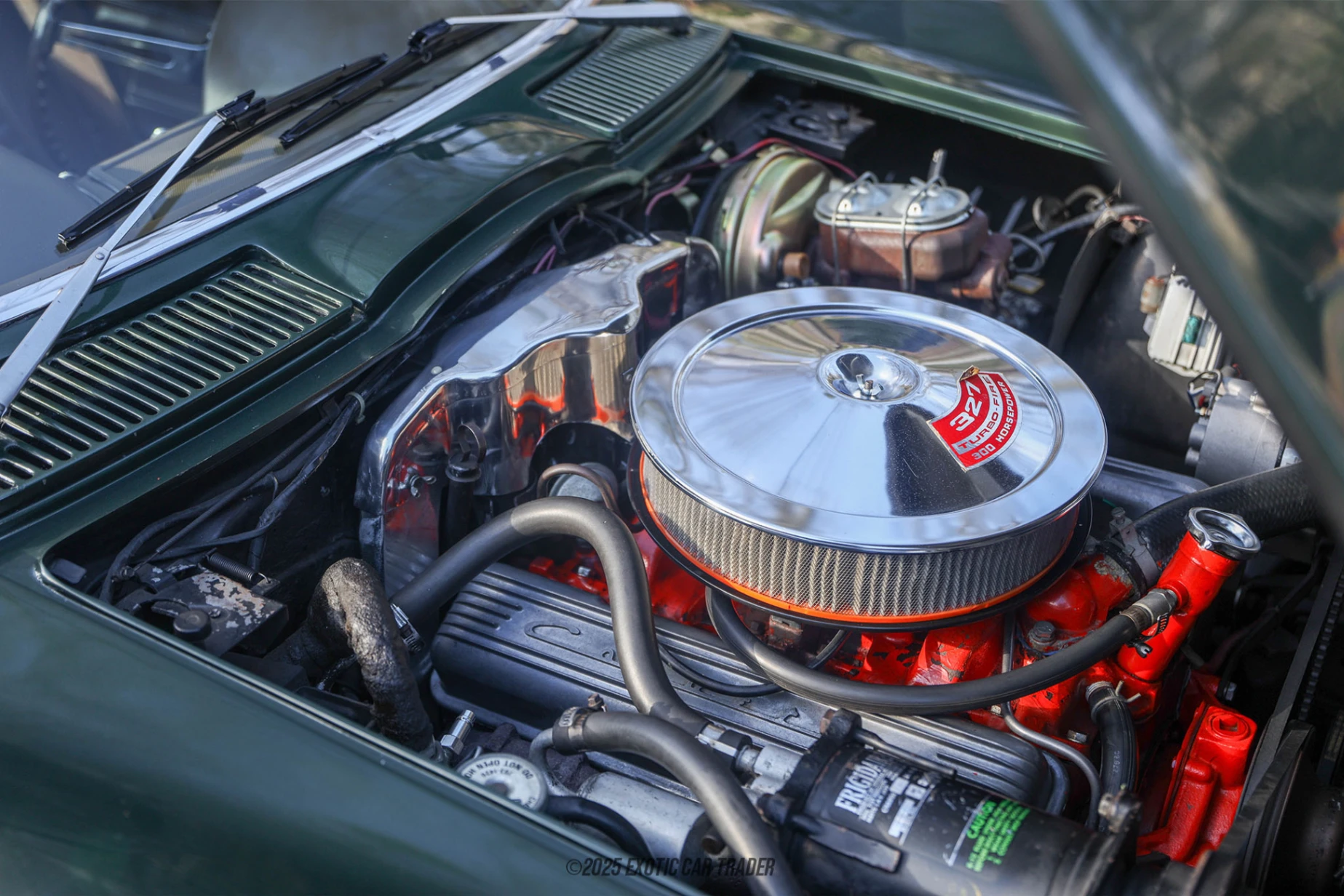 Under the hood lies a 327ci V8 rated at 300 horsepower, breathing through a 4-barrel carburetor and backed by the Powerglide 2-speed automatic transmission for smooth, classic cruising. The engine bay shows minor cosmetic enhancements—such as a polished radiator surround panel and chrome-style valve covers—while retaining the authentic layout of a small-block C2. Independent front and rear suspension with a transverse leaf spring, along with 4-wheel disc brakes, provide the balanced handling and confident stopping power that made the C2 revolutionary in its day. With dual exhaust, period-correct components, and reliable maintenance items in place, this Corvette delivers a true vintage driving experience with tasteful improvements that enhance both presentation and usability.