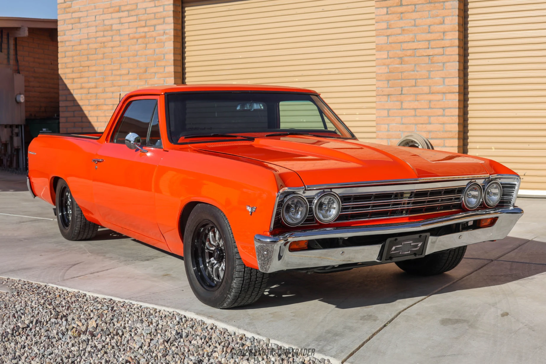 The exterior of this 1967 Chevrolet El Camino is finished in a custom orange paint job that highlights the sharp body lines and aggressive stance unique to the 1967 model year. Quad headlights, chrome front and rear bumpers, and blacked-out trim give the truck a clean, purposeful look, while the lowered suspension and aftermarket wheels add a subtle modern edge. A spray-in bed liner protects the cargo area and enhances overall usability without detracting from the vehicle’s visual appeal. The interior of this 1967 Chevrolet El Camino features a reupholstered black vinyl cabin accented by a custom orange-painted dashboard that ties seamlessly into the exterior color. The layout remains simple and driver-focused, with a classic aftermarket steering wheel and period-style gauges reinforcing the vintage feel. Modern conveniences include air conditioning and a Retrosound head unit with Bluetooth connectivity, allowing for comfortable cruising without compromising the truck’s classic aesthetic.