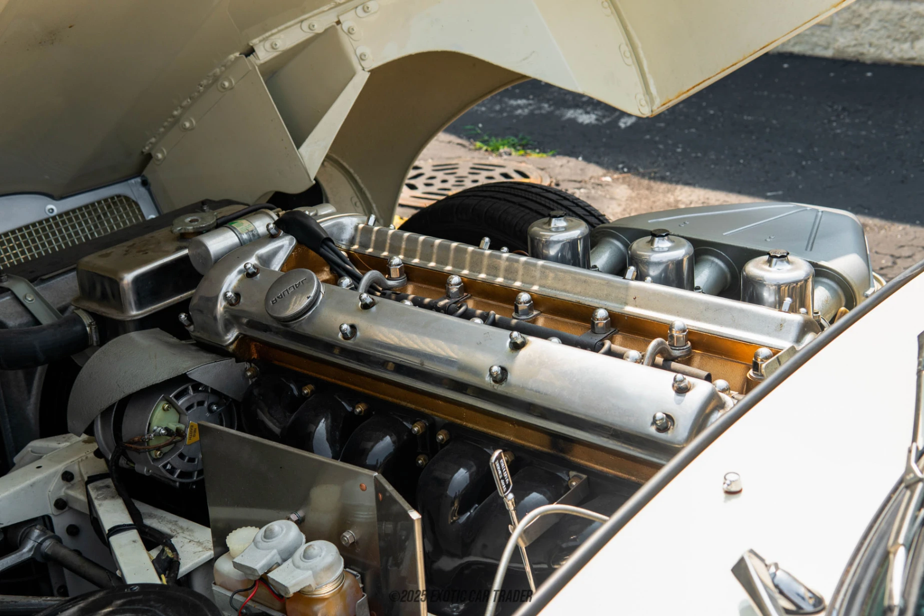 Coming in the stylish coupe body style, this 1967 Jaguar XKE Series is painted in a shade of creamy white, which is very representative of the Sixties. Its sleek stance is accentuated by its headlamp covers with chrome trim, as well as the chrome window outlines, bumpers, and badge bar. Even the wire-style wheels have reportedly been rechromed, as chrome was a symbol of luxury in the Fifties and Sixties. The interior of this 1967 Jaguar XKE Series features two black leather seats and a cargo area directly behind. It’s a period-correct affair, right down to the wood-rimmed steering wheel, Smiths analog dials, and manual gear shifter. However, the radio has been upgraded to a more modern unit which retains a classic style, and we suspect that the door speakers have been upgraded too. That’s a nice upgrade because let’s face it, cruising in an E-Type too your favorite music is definitely a bucket list item for any petrolhead.