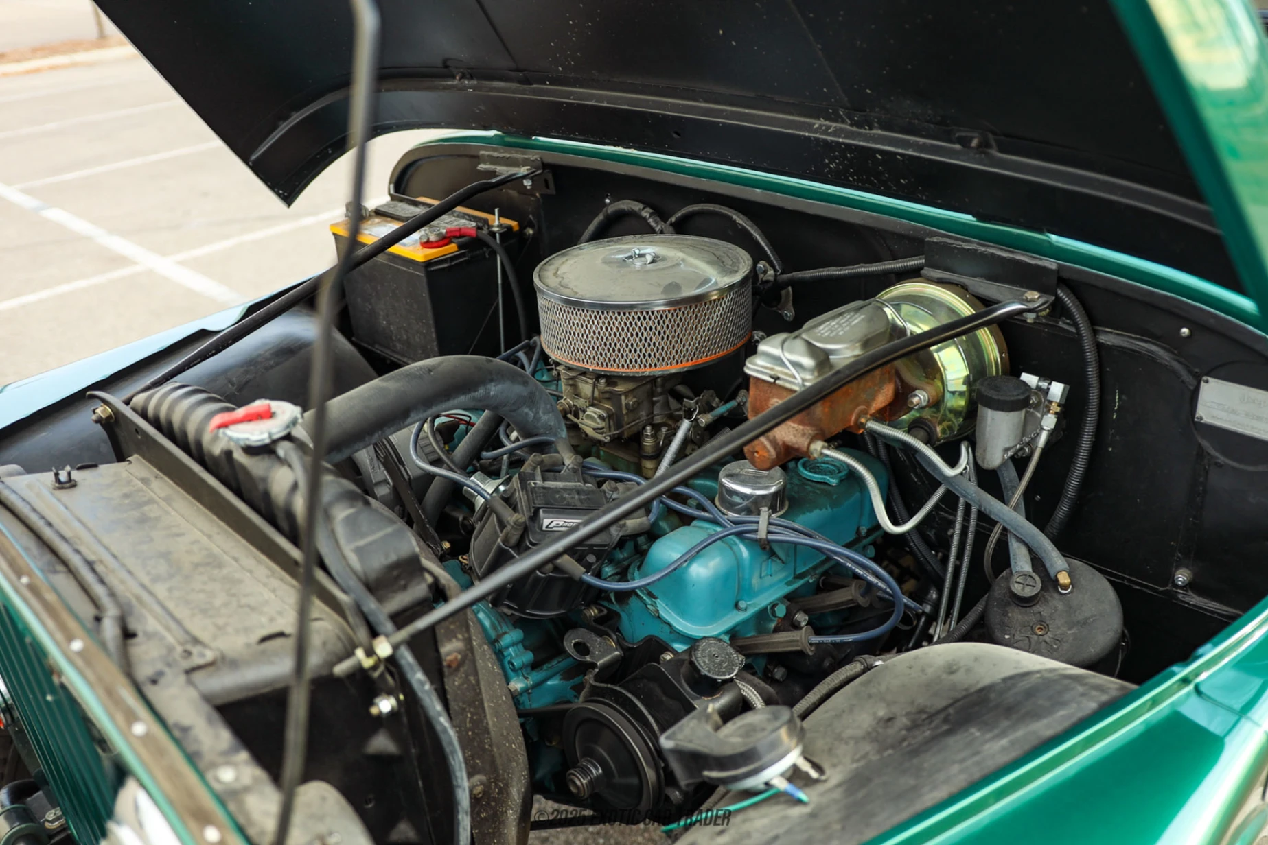Under the hood, this CJ-5 runs the Dauntless 225ci V6, known for its strong low-end torque and smooth operation. The 3-speed manual transmission pairs with a Dana 18 twin-stick transfer case, enabling both high and low range selection. A Dana 27 front axle and Dana 44 rear axle provide the classic CJ drivetrain structure, supported by manual locking hubs up front. The engine bay shows tidy routing, an added brake booster, and well-preserved factory hardware. Altogether, the mechanical setup reflects a straightforward, durable, and authentic 1960s Jeep driving experience.
