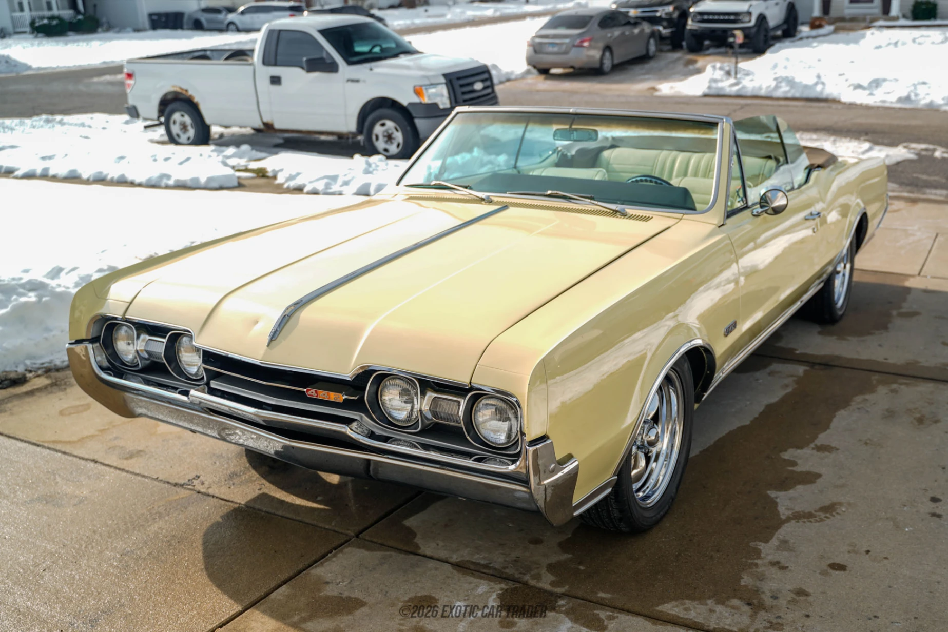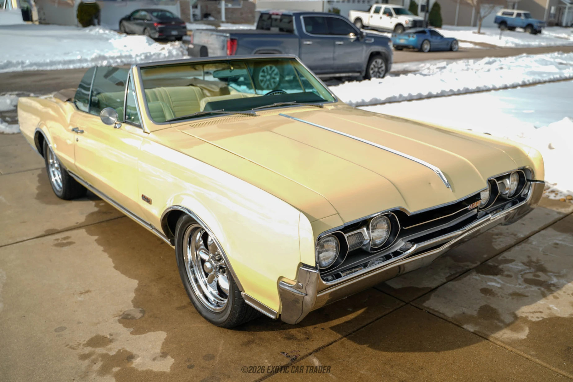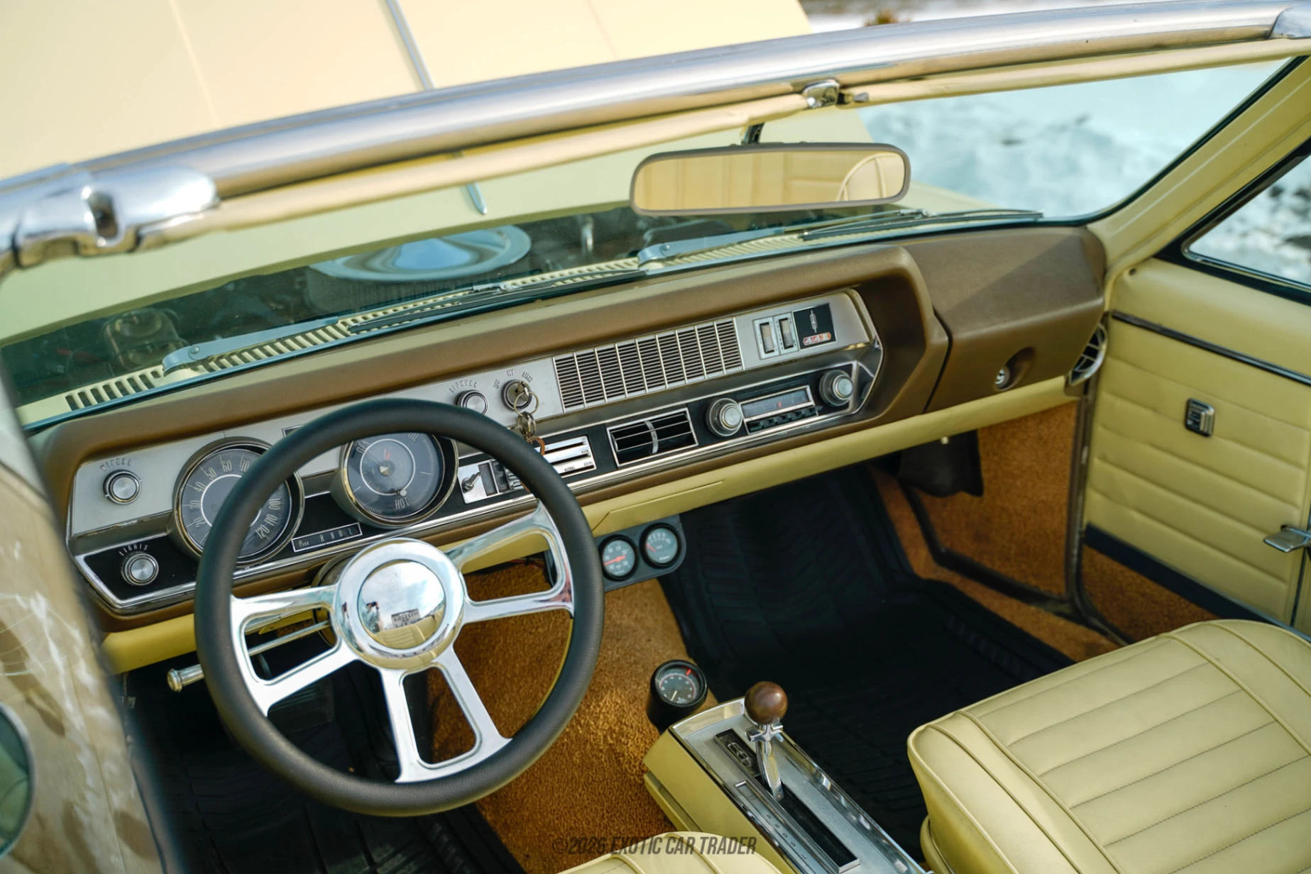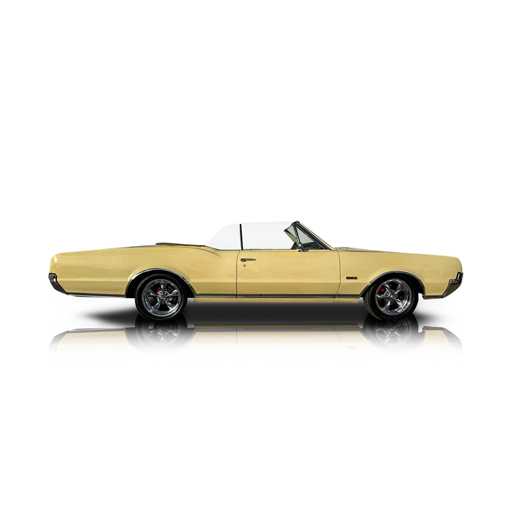 The car is finished in Saffron Yellow, a period-correct color that suits the Cutlass body lines and highlights its muscle-era character. Chrome trim and 17” aftermarket wheels give it a clean, slightly modernized stance without straying too far from its classic roots. A power tan convertible top allows for easy open-air driving. Inside, the yellow interior continues the color-matched theme and features bucket seats, power windows, and a tilt steering column. The cabin retains its classic Oldsmobile layout while offering improved comfort and usability.