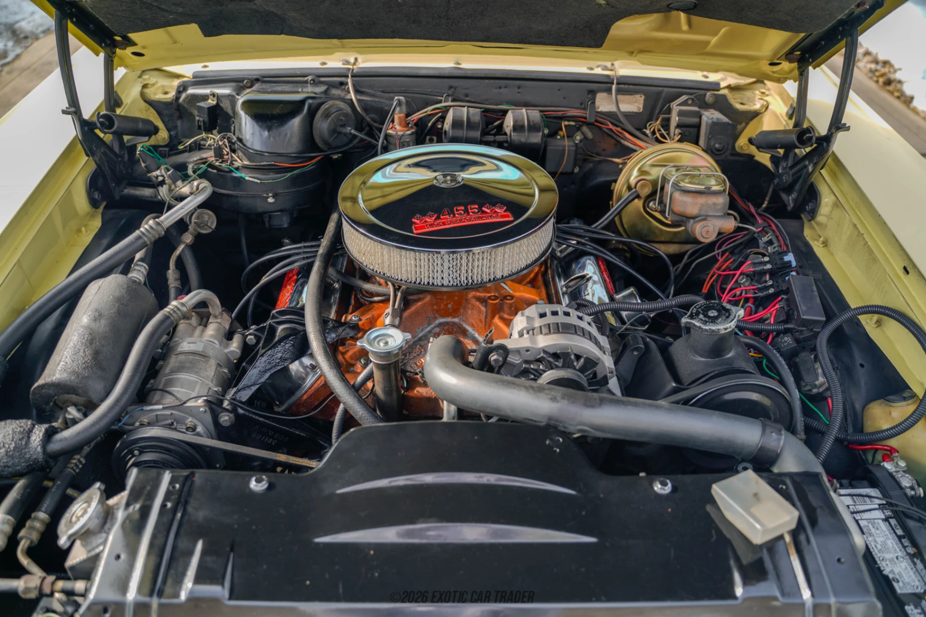 Power comes from a 455ci naturally aspirated V8, equipped with a Holley 4-barrel carburetor and an Edelbrock intake manifold, delivering strong low-end torque and classic big-block character. The engine is paired with a TH400 3-speed automatic transmission, sending power to the rear wheels. Handling and stability are improved through aftermarket suspension components, including control arms and a sway bar, while upgraded fuel lines enhance reliability. Braking has been modernized with 4-wheel disc brakes, and power steering ensures easy maneuverability. A Hooker dual exhaust system completes the package, giving the car an appropriately aggressive sound to match its performance-oriented setup.