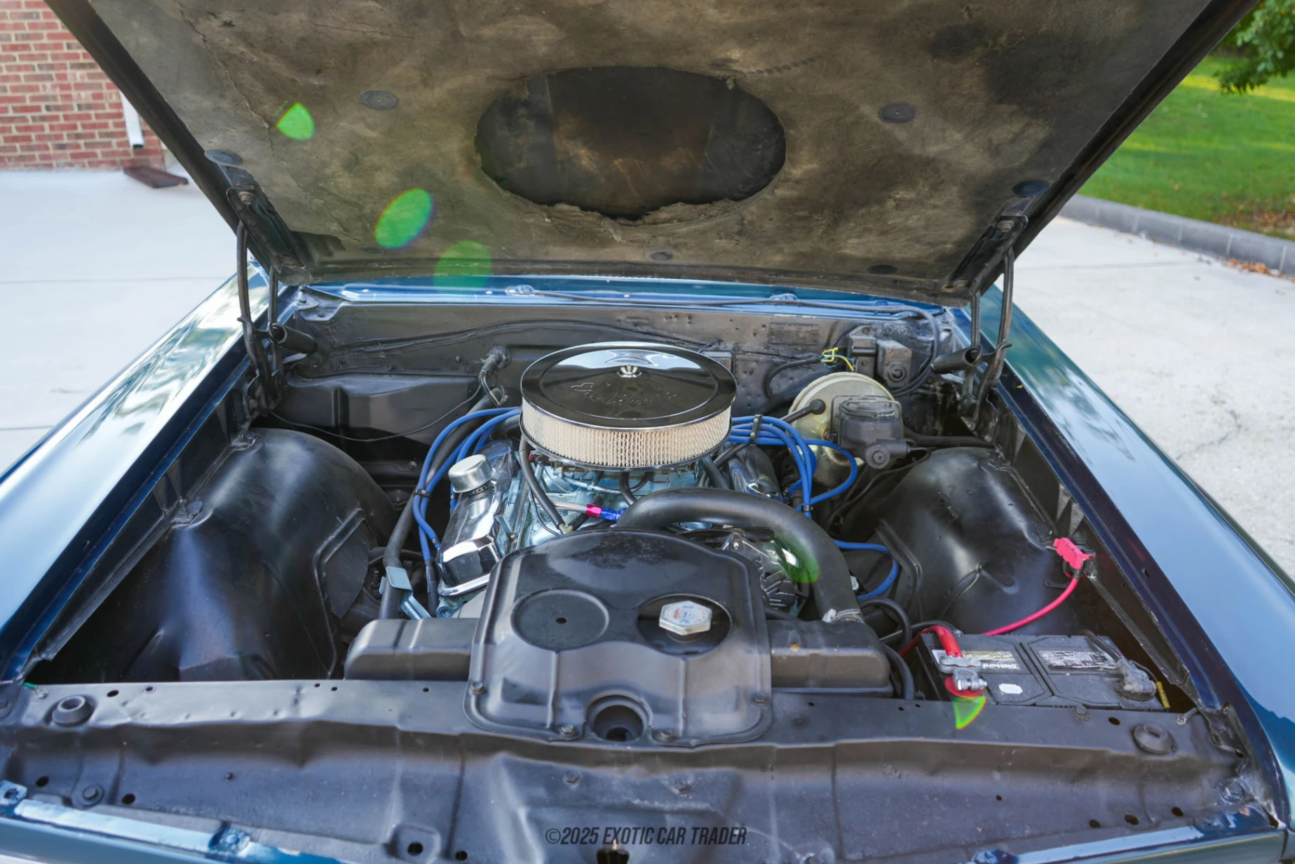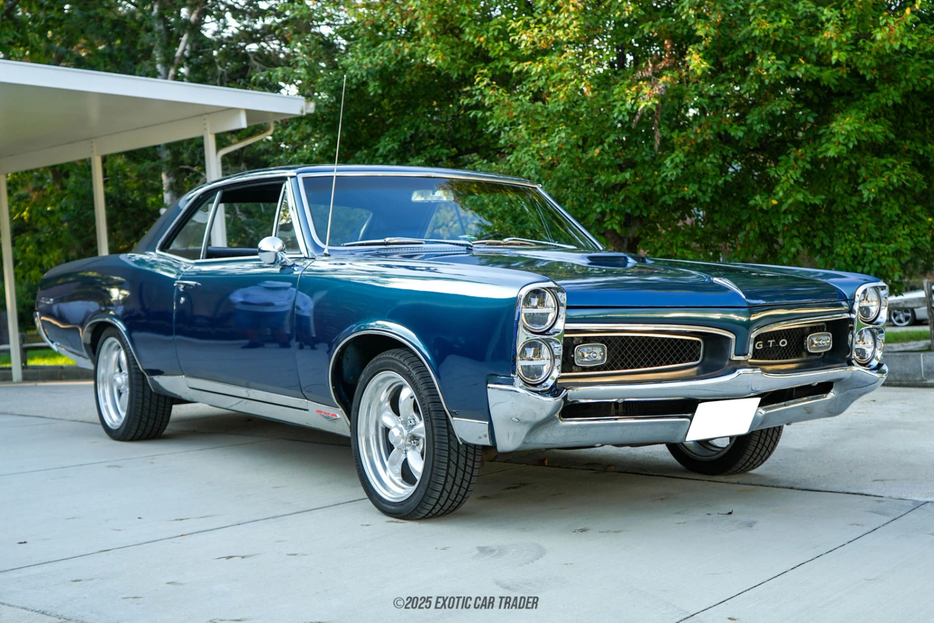 The body has been previously repainted in blue, presenting a striking contrast with chrome accents and aftermarket wheels that give the car a purposeful stance. An aftermarket dual-exit exhaust with Flowmaster mufflers adds to its visual and audible presence, while upgraded disc brakes provide modernized stopping power. Inside, the cabin is equipped with black bucket seats and replacement door panels, ensuring comfort while maintaining a period-correct look. The cockpit design remains driver-oriented, reinforcing the GTO’s muscle car ethos with a no-nonsense, performance-first layout.