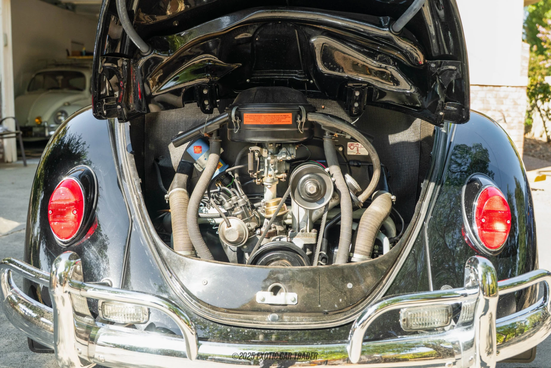 The exterior is finished in elegant black, complemented by chrome trim, chrome bumpers with overriders, VW logo mudflaps, and whitewall tires mounted on painted steel wheels with chrome hubcaps. Together, these elements capture the period-correct charm of mid-century European motoring. The black cloth convertible top with a white headliner enhances its classic contrast and sophistication. Inside, the cabin is adorned with a black interior featuring authentic VDO gauges, a Wolfsburg crest horn button, and a period radio. The presentation reflects the quality of a well-preserved example, maintaining the Beetle’s warm, minimalist character.