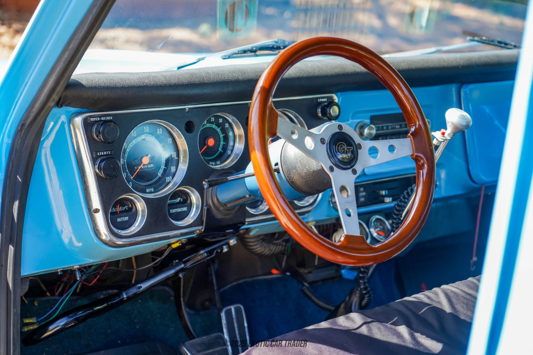 The exterior presents clean and simple lines, dressed in a traditional blue finish that enhances the C10's long, purposeful profile. A side step adds both visual character and practicality, especially for easier access to the bed. The interior continues the functional theme with a black cabin that complements the truck's utilitarian nature. Though minimalistic, it remains tidy and purposeful, consistent with the character of the era.