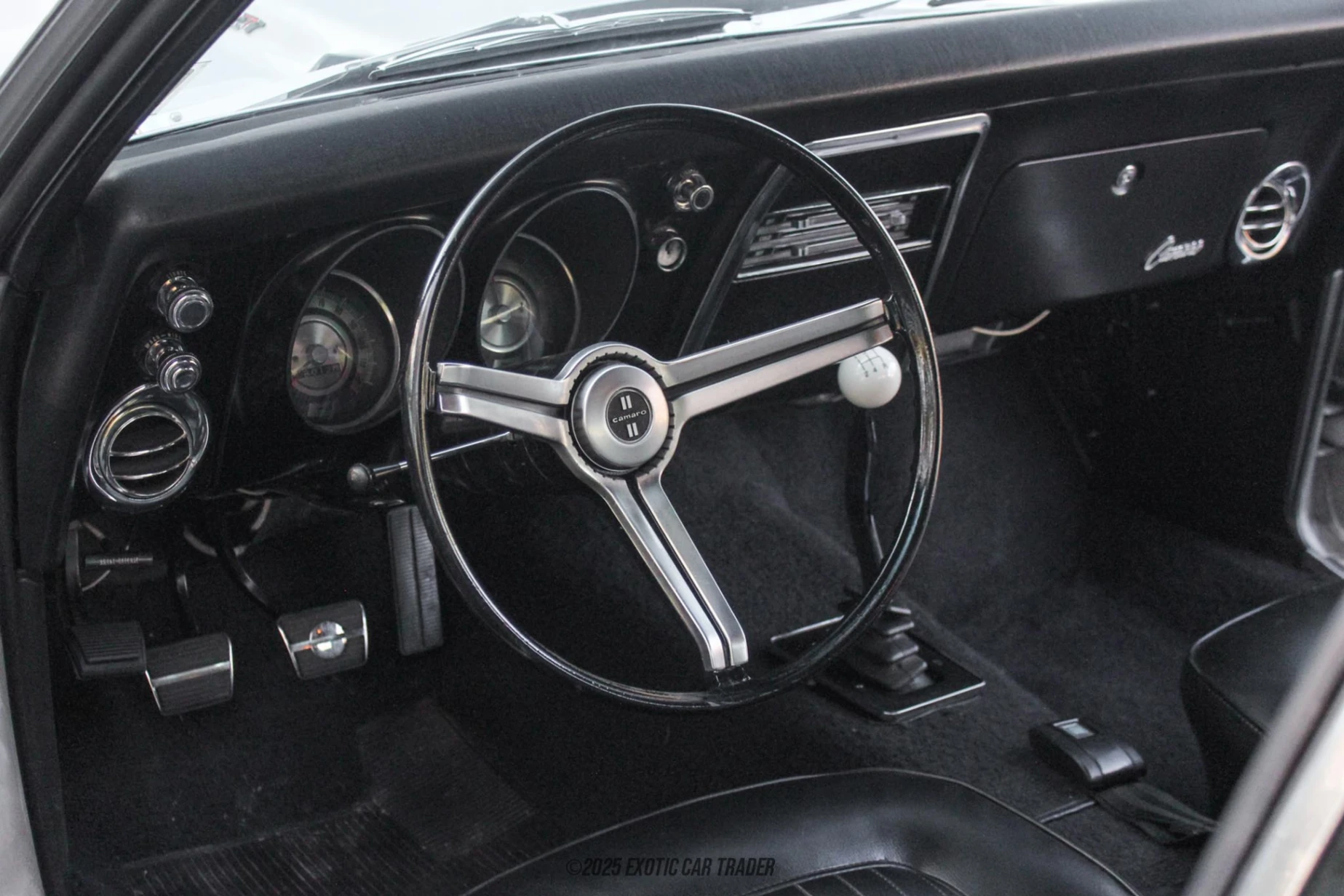 The bodywork is presented in show-quality condition, finished in Cortez Silver with the iconic cowl induction hood and painted steel wheels capped by classic "poverty" hubcaps. Redline tires wrap the wheels to complete the vintage silhouette, while the stance is subtly enhanced by the custom suspension setup. Inside, the cabin has been completely reupholstered, featuring black leather bucket seats and freshly fitted carpeting, headliner, and door panels. The dashboard and gauge cluster have been upgraded with aftermarket components, offering a balance of modern functionality and vintage flair. A rare fold-down rear seat further distinguishes this Camaro from its peers, blending practicality with collectible appeal.
