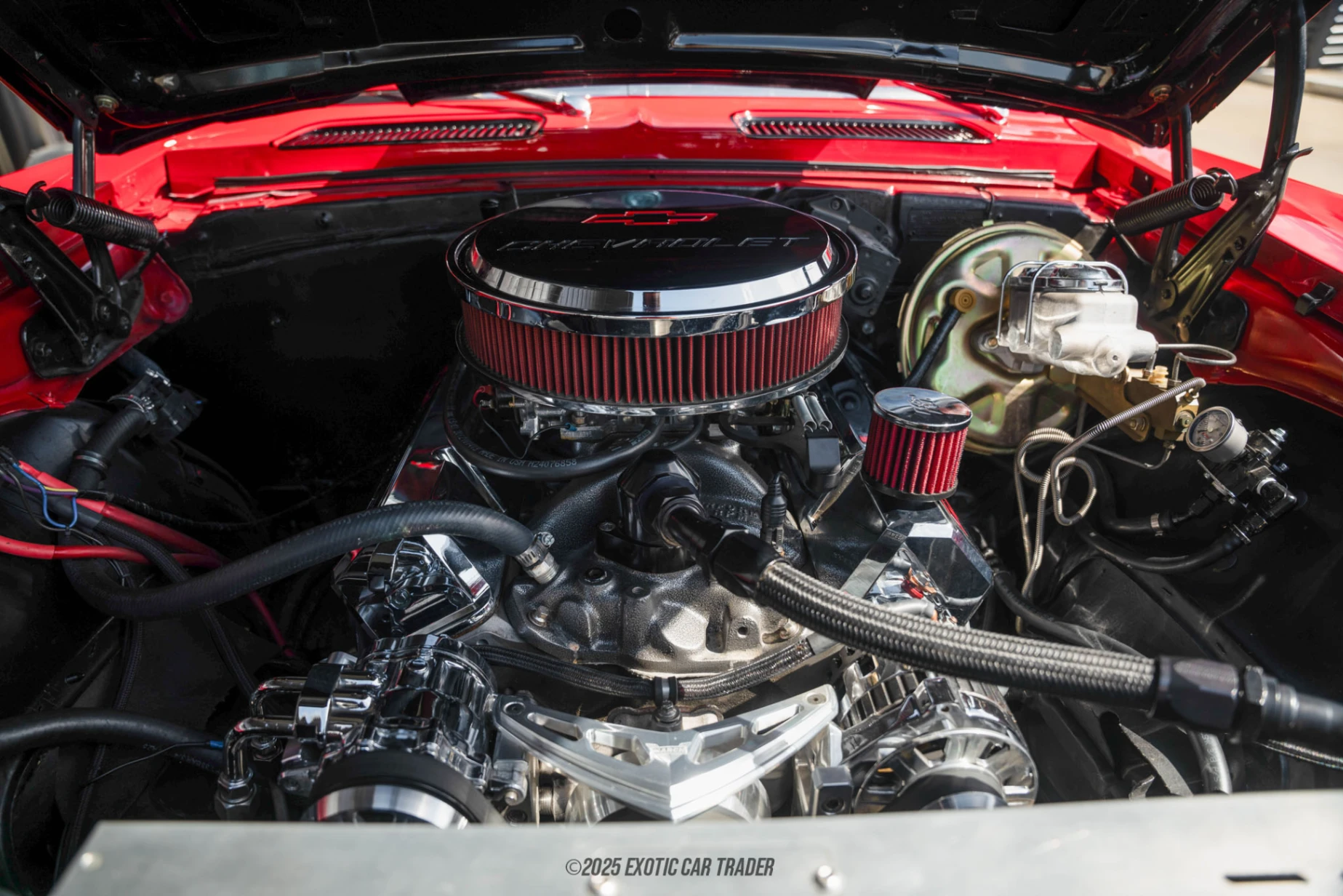 This 1968 Chevrolet Camaro SS comes in bright red, and features black dual rally stripes for a striking two-tone effect. The car’s muscular, sinister design really plays well with the two-tone effect, as well as its aftermarket wheels and SS badging. Tinted windows add a further sense of anticipation as this Camaro rumbles down the street, with its chrome bumpers and rear deck lid spoiler adding further design interest points for onlookers to note. You’ve also got a car cover to protect it with when parked. The interior of this 1968 Chevrolet Camaro SS continues the red theme, and comes with reupholstered seats plus a replaced dashboard. It’s a comfortable four-seat affair and comes with some upgrades such as an aftermarket touchscreen head unit, upgraded white-faced gauges from Dakota Digital and even a Vintage Air heating and air conditioning system! Yes, this Camaro is well-equipped for regular driving duties, maybe even an active contender for the daily school and office run if you please!
