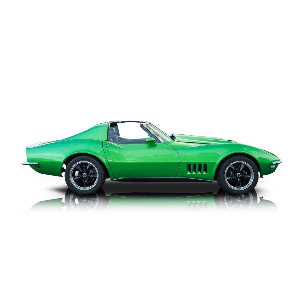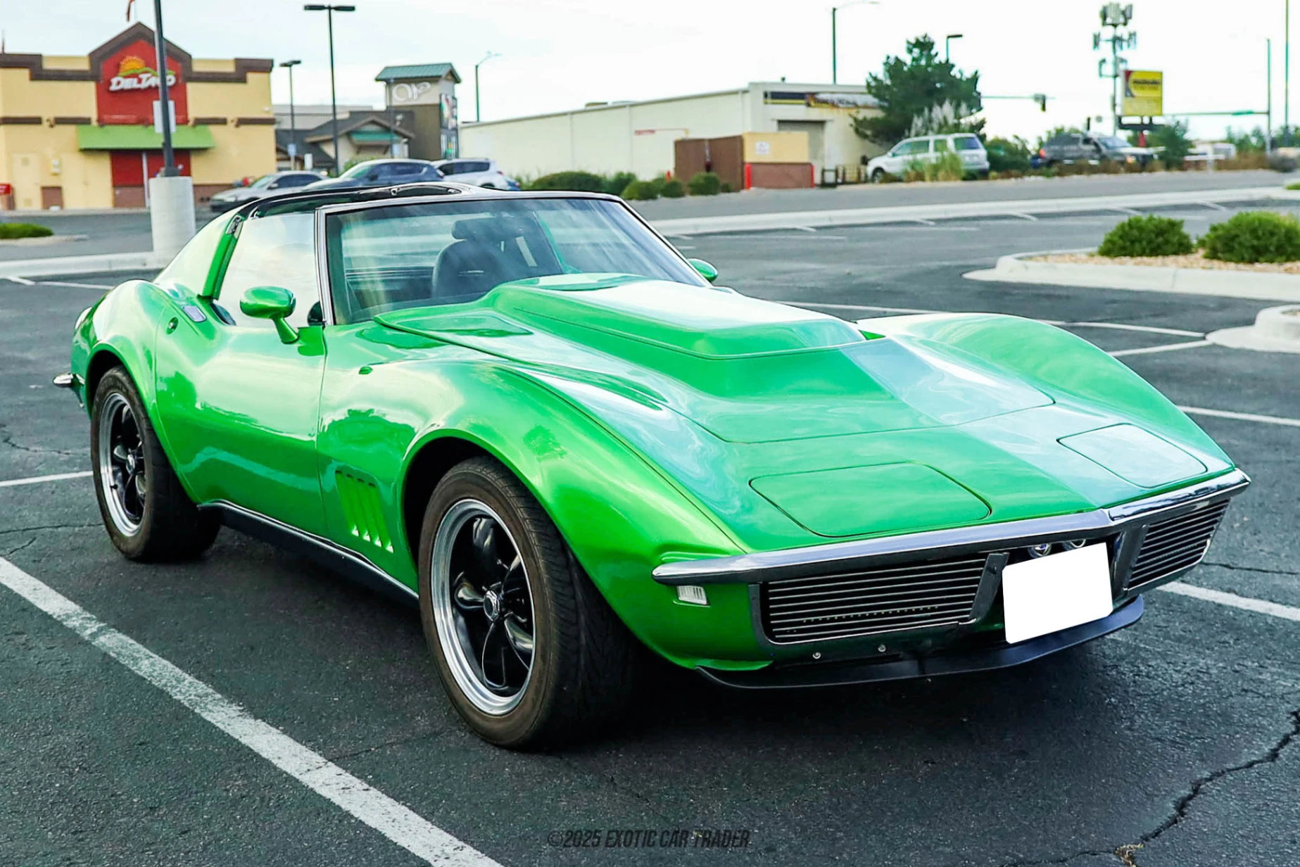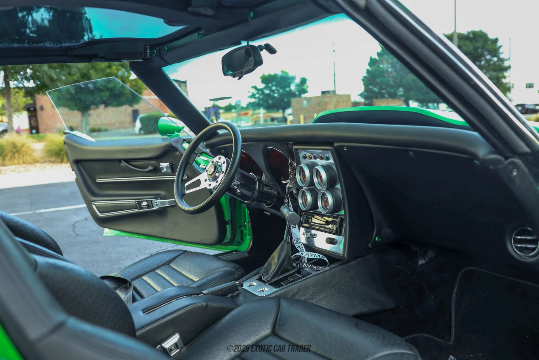 There’s no missing this 1968 Chevrolet Corvette in a crowded car park! Finished in green with a stunning custom paint job, this Corvette stands out. Other custom features include custom exhaust tips that hint at the car’s mechanical upgrades, while chrome detailing in the engine bay adds polish under the hood. Inside, the black interior is highlighted by unique ostrich-pattern seats, lending a bespoke flair not often seen in vintage Corvettes.