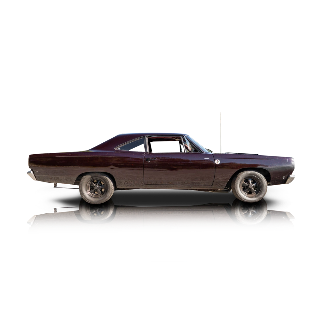 This 1968 Plymouth Road Runner comes wearing Black Cherry Metallic paint and riding on a set of black-painted 5-spoke steel-styled wheels with Cooper Cobra Radial G/T tires. Yes, the vehicle’s exterior color theme tends towards the darker end of the spectrum, but the car is definitely a head-turner, nevertheless. Its long and low profile, quad headlamps and Road Runner emblems all attract just the right amount and kind of attention. A blacked-out front grille and chrome bumpers are also present. The black and burgundy two-tone interior of this 1968 Plymouth Road Runner features a two-tone dash, a burgundy headliner and the aforementioned Pioneer aftermarket radio. The interior shows signs of its age, and is definitely unrestored, but isn’t run down either. You’ve also got a B&M floor shifter in chrome, and a custom 3-spoke steering wheel.