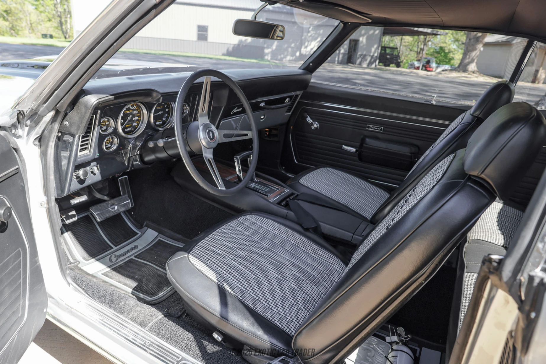 The exterior of this 1969 Chevrolet Camaro Restomod is finished in classic Cortez Silver, a timeless factory-inspired color that perfectly complements the car’s aggressive stance. Black racing stripes add a layer of visual intensity, while aftermarket wheels and a lowered, performance-oriented suspension give the car a purposeful, road-hugging look. Subtle SS badging enhances its muscle car identity, while upgrades like subframe connectors reinforce the chassis for improved rigidity—an important enhancement given the car’s substantial power output. The interior of this 1969 Chevrolet Camaro Restomod stays true to its heritage while incorporating tasteful upgrades. The reupholstered black and white houndstooth seats deliver an authentic vintage feel, paired with a center console for added functionality. AutoMeter gauges provide precise, modern readouts while maintaining a classic aesthetic, and the aftermarket steering wheel and floor shifter enhance driver engagement. Altogether, the cabin strikes a balance between nostalgic design and performance-focused usability.
