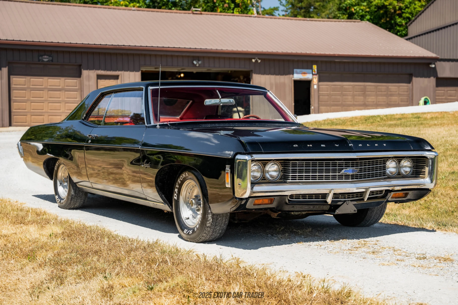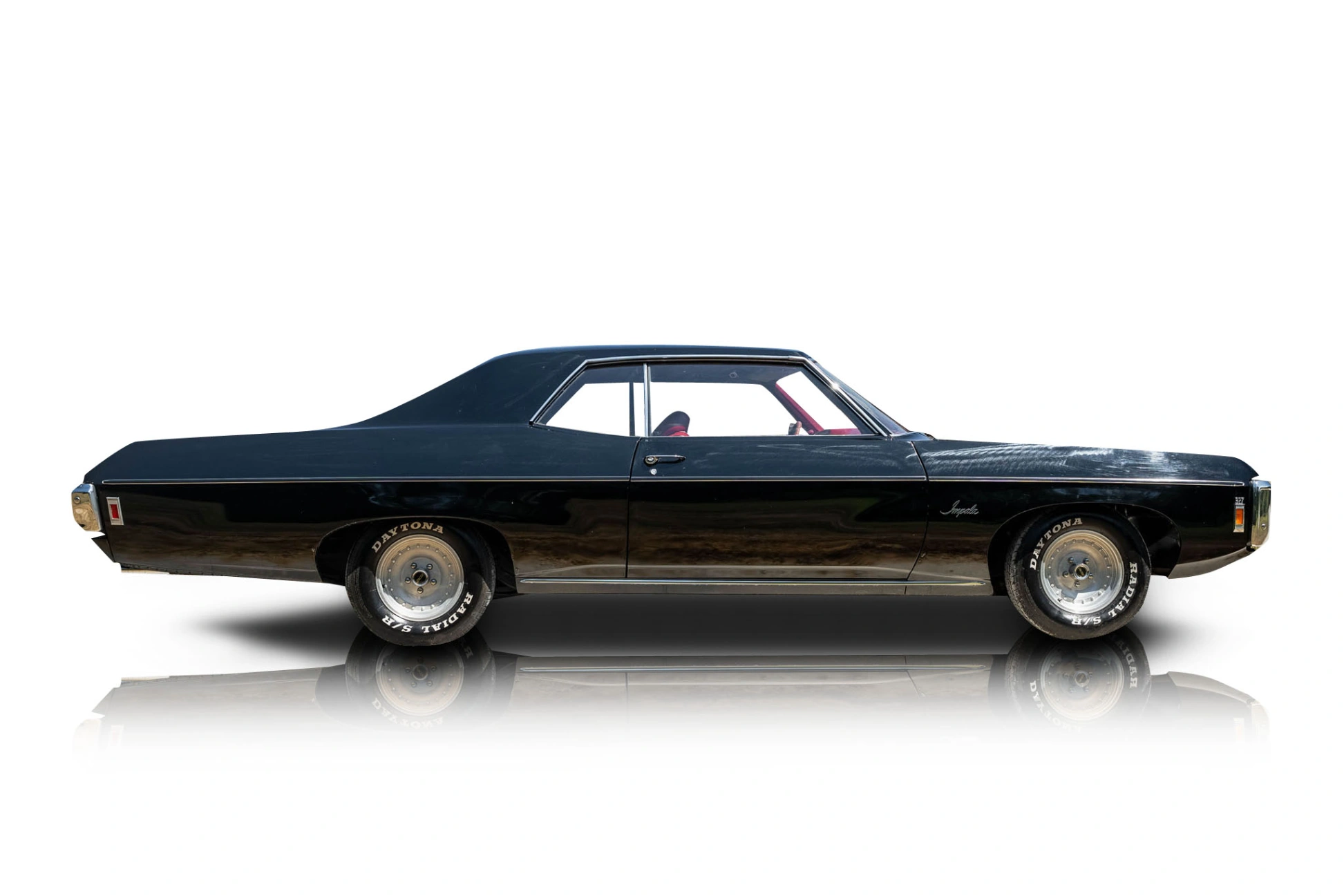 This 1969 Chevrolet Impala two-door hardtop coupe captures the spirit of full-size American muscle from the late 1960s. Finished in black over a bright red vinyl interior, this example is powered by a 327 cubic-inch Turbo-Fire V8 paired with a classic “3-on-the-tree” 3-speed manual transmission. The Impala was Chevrolet’s flagship full-size car during this era, and this example maintains its original layout while benefiting from some tasteful upgrades, making it an ideal weekend cruiser or local showpiece.