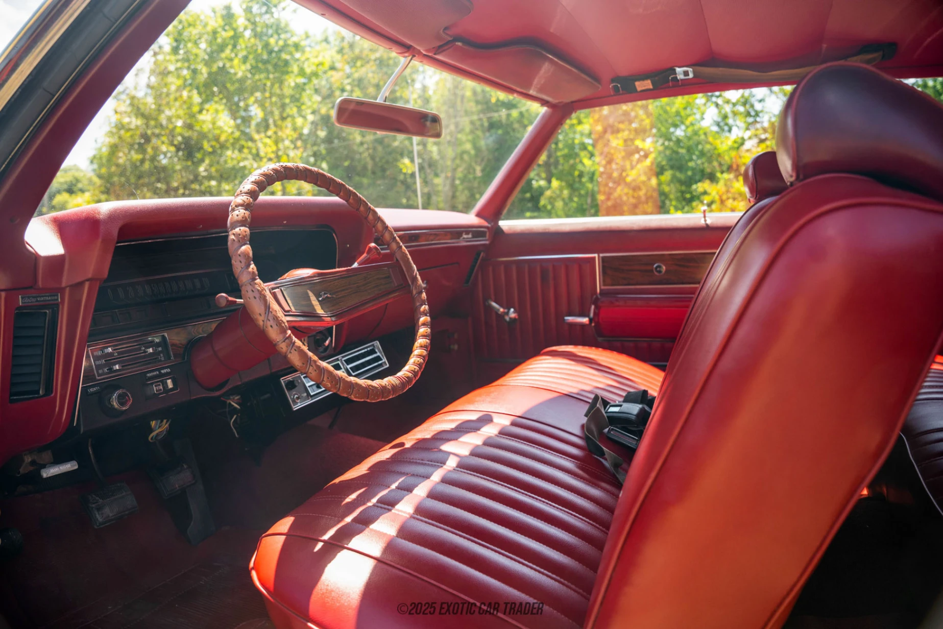 The body is finished in a deep black that suits the long, sweeping lines of the Impala’s hardtop design. The paint appears in good condition, matching well with the contrasting bright red vinyl interior. Aftermarket slotted aluminum wheels give the car a slight custom touch without veering into full restomod territory. Inside, the bright red vinyl seating and door panels give off a classic Americana vibe, set off by the clean dashboard and original-style instrumentation. This coupe benefits from air conditioning, offering added comfort on warm day which is something rarely seen in older muscle cars still equipped with a manual gearbox.