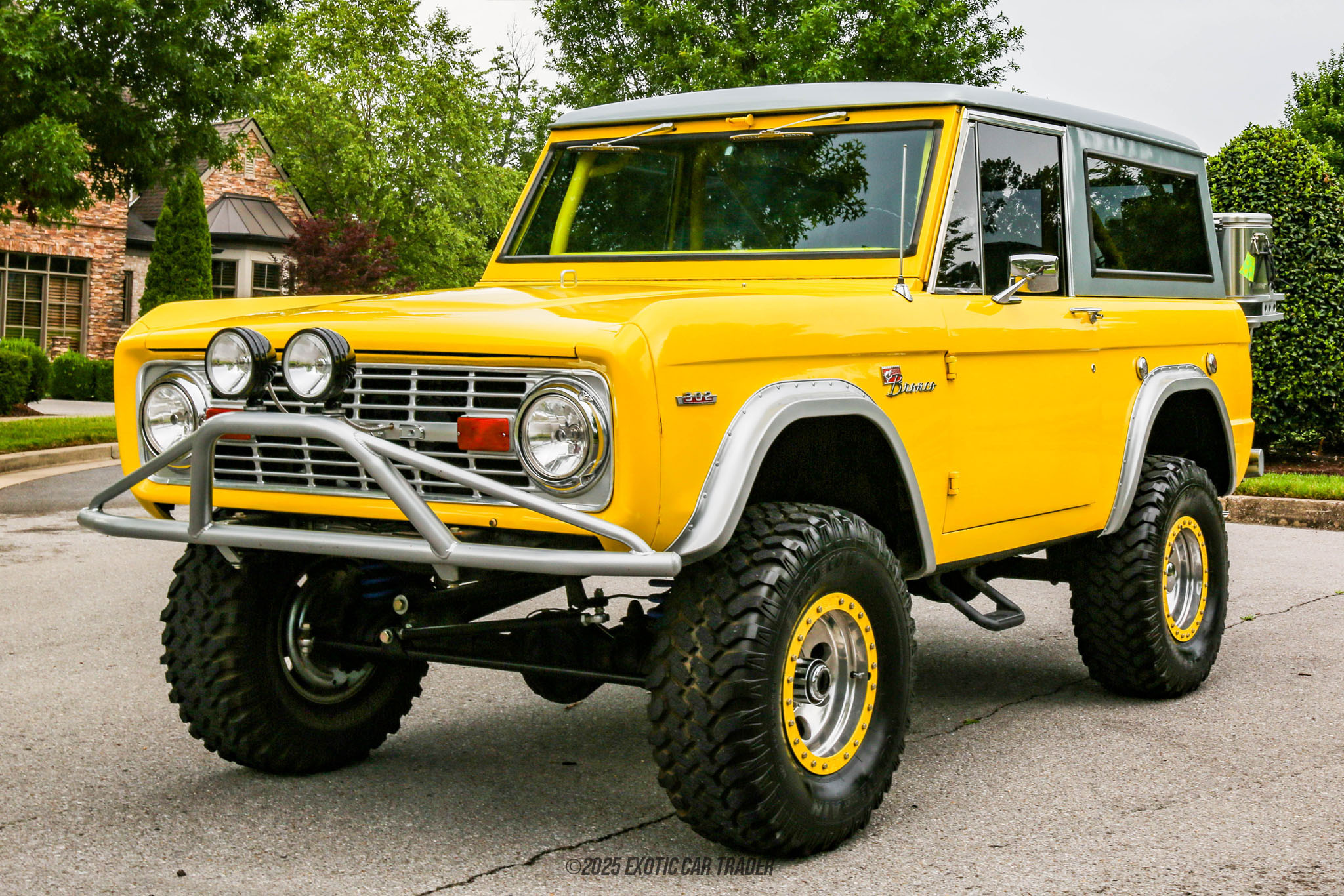 This 1969 Ford Bronco wears a very nice coat of yellow paint, with gray adorning the roof and pillars for a striking two-tone effect that really complements its two-door, short-wheelbase stance. Paired with the vehicle’s minimal overhangs for excellent approach and departure angles, plus its chunky tires on silver and yellow rims, this Bronco is definitely ready to head off-road at the mere suggestion of the idea. You’ll also note its auxiliary lights atop the roof, as well as on the front-mounted crash bar. Out back, we find a storage box and an externally-mounted spare tire as well. The interior of this 1969 Ford Bronco has been finely restored and kept largely stock. We’ve got gray seats and a retro-modern styled push-button radio. We also see some air vents but aren’t informed if there’s air conditioning on offer.