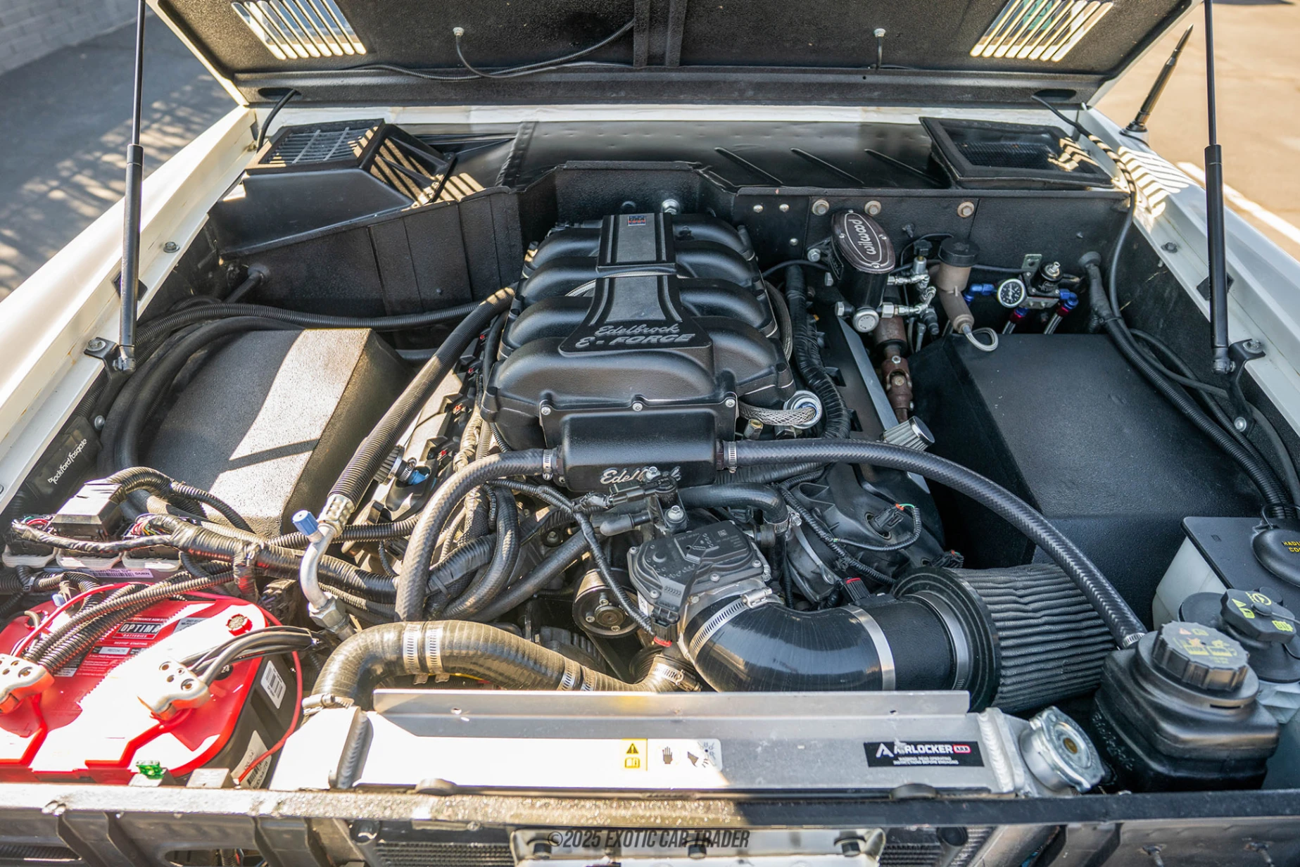 Under the hood lies a Coyote 5.0L Supercharged V8, boosted by an Edelbrock E-Force supercharger for breathtaking performance. The ZF 5-speed manual gearbox provides precise control, while the 4x4 drivetrain, ARB front & rear lockers, and high-output onboard air compressor ensure top-tier off-road capability. The build incorporates advanced touches such as a Dakota Digital VHX control system, billet electrical controls, and an upgraded cooling setup for reliability under demanding conditions. With features like Vintage A/C, power windows, and USB-C ports, this Bronco combines modern-day comfort with muscle and capability, standing as an exceptional example of a high-end restomod done right.