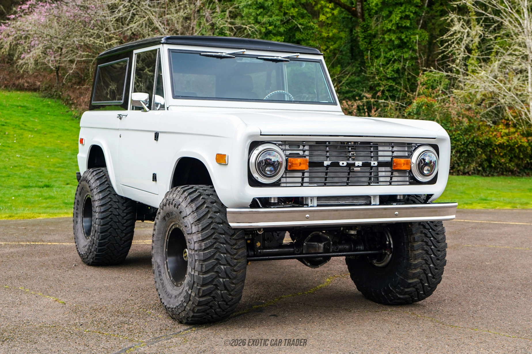 With a white suit, this lifted 1969 Ford Bronco sits tall and proud above the terrain. It’s got some truly meaty 37-inch Toyo Open Country Mud-Terrain tires wrapped around classic-styled steelies in black. The hubs are Warn locking units, while the suspension has got to be aftermarket given the vehicle’s raised stance. The removable hardtop rear portion of the roof comes in contrasting black. While the vehicle’s grille and turn signals are original style, its circular headlamps have been upgraded to LED projector units, ensuring optimal visibility when driving down unlit roads on a dark night. The black interior of this 1969 Ford Bronco is a lovely surprise from the moment you enter it. Some freshly upholstered leather seats await you and up to three passengers. There’s an aftermarket steering wheel and gear shifter, plus transfer case lever knob. The dashboard retains a classic look but features a modern heating and ventilation system. We aren’t sure if there is air conditioning though. Between the front seats lies a custom center console made from wood, with steel cup holders and a storage space as well. The door inners also feature some wood trim, but retain wind-up windows to remind you that not everything needs power assistance. We don’t see a stereo but there appears to be a blanking plate, so you can fit whatever you wish.