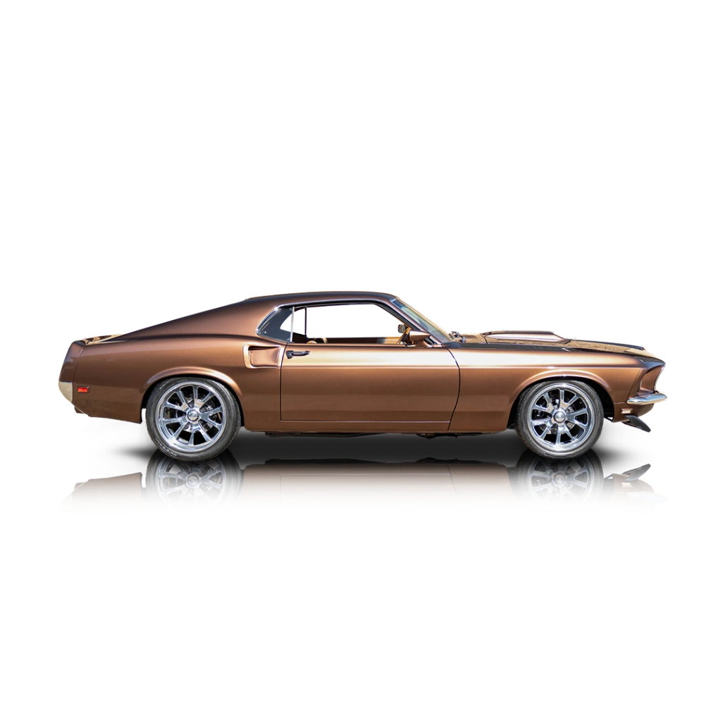 Finished in a custom bronze exterior color, the Mustang retains its original fastback proportions while benefiting from a purposeful restomod stance. Modern alloy wheels subtly update the appearance without detracting from the car’s classic lines. Inside, the cabin has been refinished in tan upholstery, creating a clean and cohesive interior that blends vintage Mustang design cues with updated materials. The result is an interior that feels period-correct at a glance but offers improved comfort and fit for regular driving.