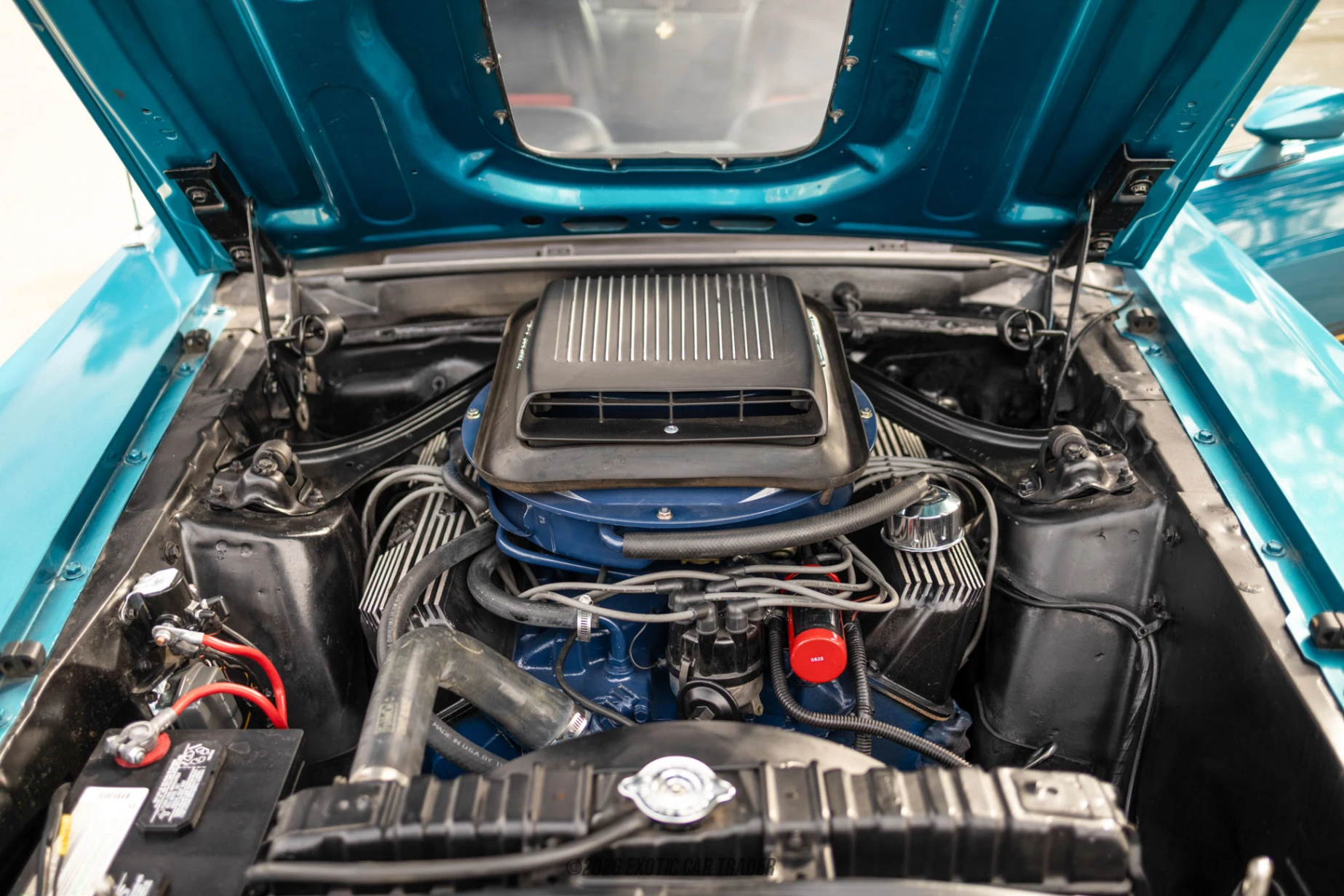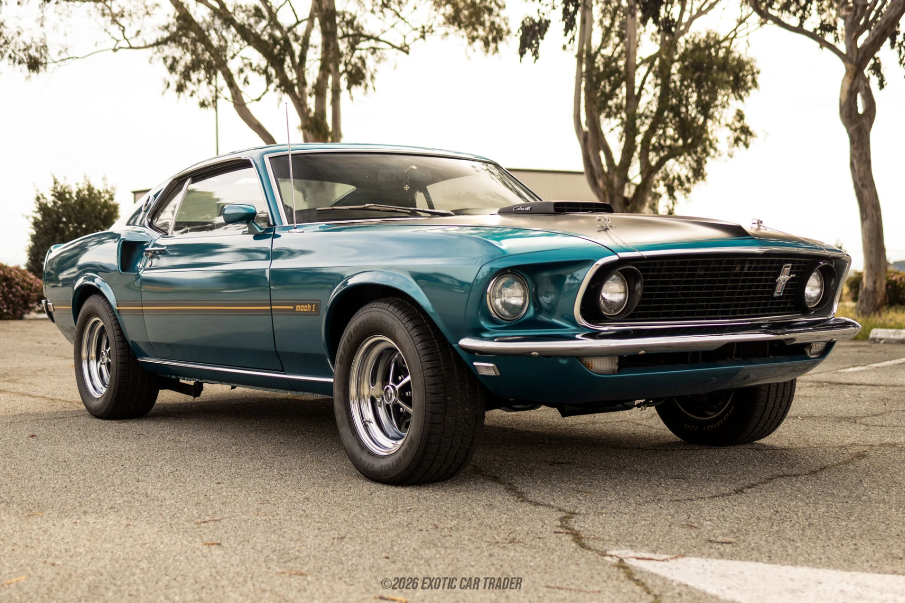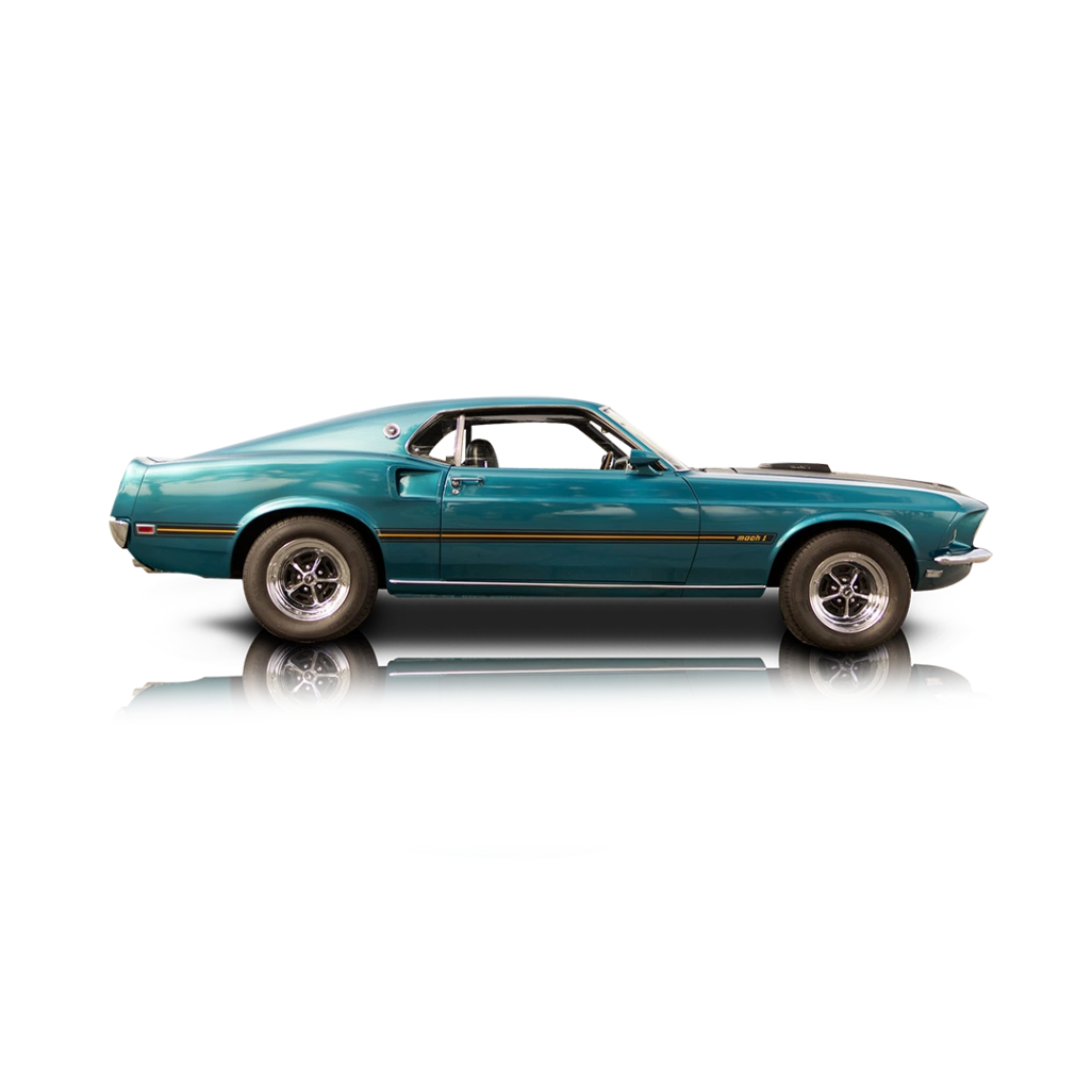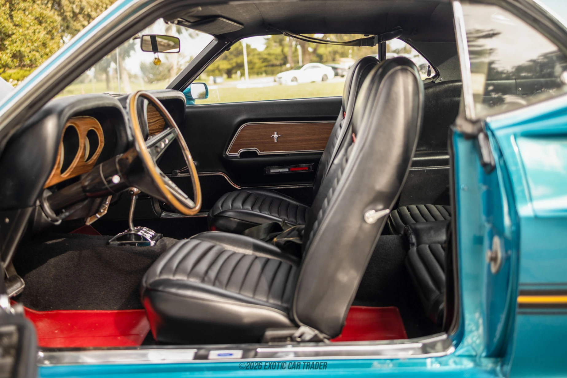 Wearing a two-tone turquoise and black coat, this 1969 Ford Mustang Mach 1 is a perfect representative of how hardcore a Ford Mustang could get back then. With its hood pins, blacked-out hood and Ram Air hood scoop, it’s basically a thinly-veiled racer that’s been somewhat tamed for road use. The car comes with chrome accents, Mach 1 badging, and aftermarket front plus rear bumpers. We’re told that it’s been repainted, albeit in original factory colors for that extra bit of originality. And how can we forget those iconic grille-mounted driving lamps, flanking the iconic Pony motif at the center? The fully refurbished interior of this 1969 Ford Mustang Mach 1 comes with black leather seats and can easily take four adults for the ride of their lives. It’s got a wood-trimmed dashboard and center console plus a wood-topped automatic gear shifter. The original Philco push-button radio resides in the console, above the sliders for the heating and ventilation system.