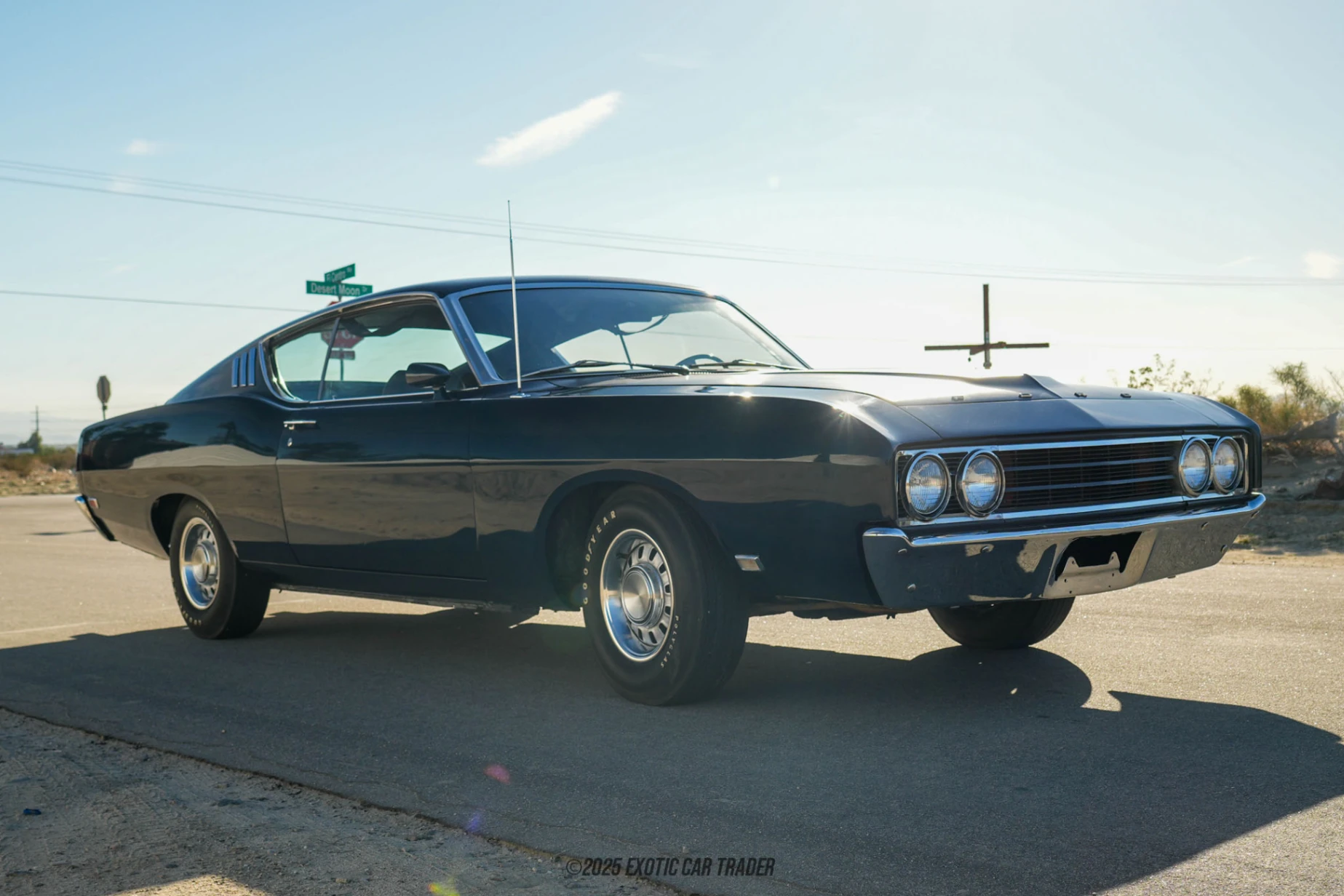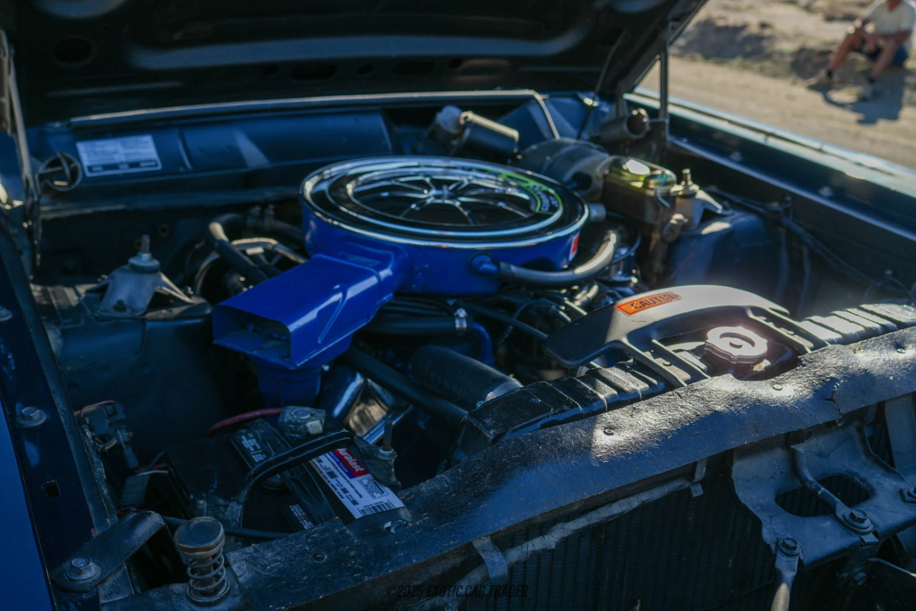 The SportsRoof fastback body was selected specifically for improved aerodynamics, giving the Torino Cobra a sleeker profile than many of its contemporaries. The Presidential Blue paint highlights the car’s long hood, wide track, and muscular proportions, while minimal chrome keeps the emphasis on function rather than excess ornamentation. The car rides on factory-style steel wheels with dog dish hubcaps, reinforcing its performance-oriented, period-correct appearance. Inside, the black vinyl interior reflects Ford’s purposeful approach, with clear instrumentation and a straightforward layout designed for driver focus rather than luxury. The cabin remains clean, correct, and true to the Cobra’s original mission.