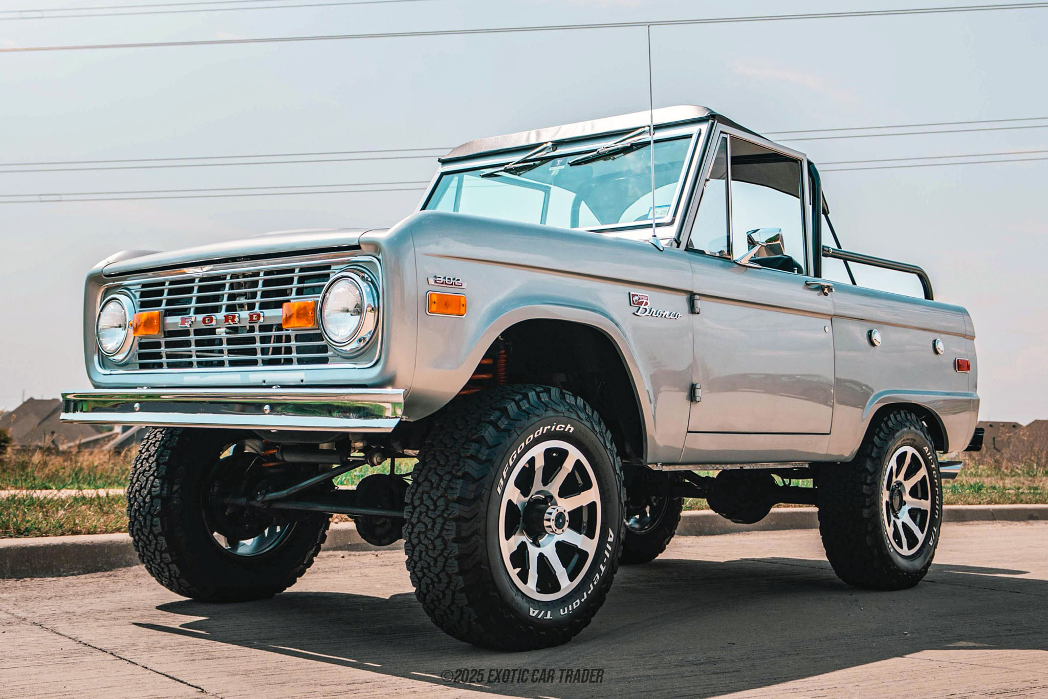 The silver exterior accentuates the Bronco’s timeless boxy lines, complemented by original fenders and a full exterior chrome kit that adds a touch of shine without sacrificing its off-road attitude. The look is completed by 15-inch polished American Racing Aspen wheels wrapped in 32x11.5 BF Goodrich KM3 tires, delivering both style and capability. Rancho suspension and a Tom’s Bronco roll bar reinforce its ready-for-anything stance. Inside, the reupholstered black interior features billet details throughout, including the steering column, door locks, and dash accents. The Grant steering wheel adds a classic touch, while the A/C system and modern lighting upgrades ensure daily usability and comfort.