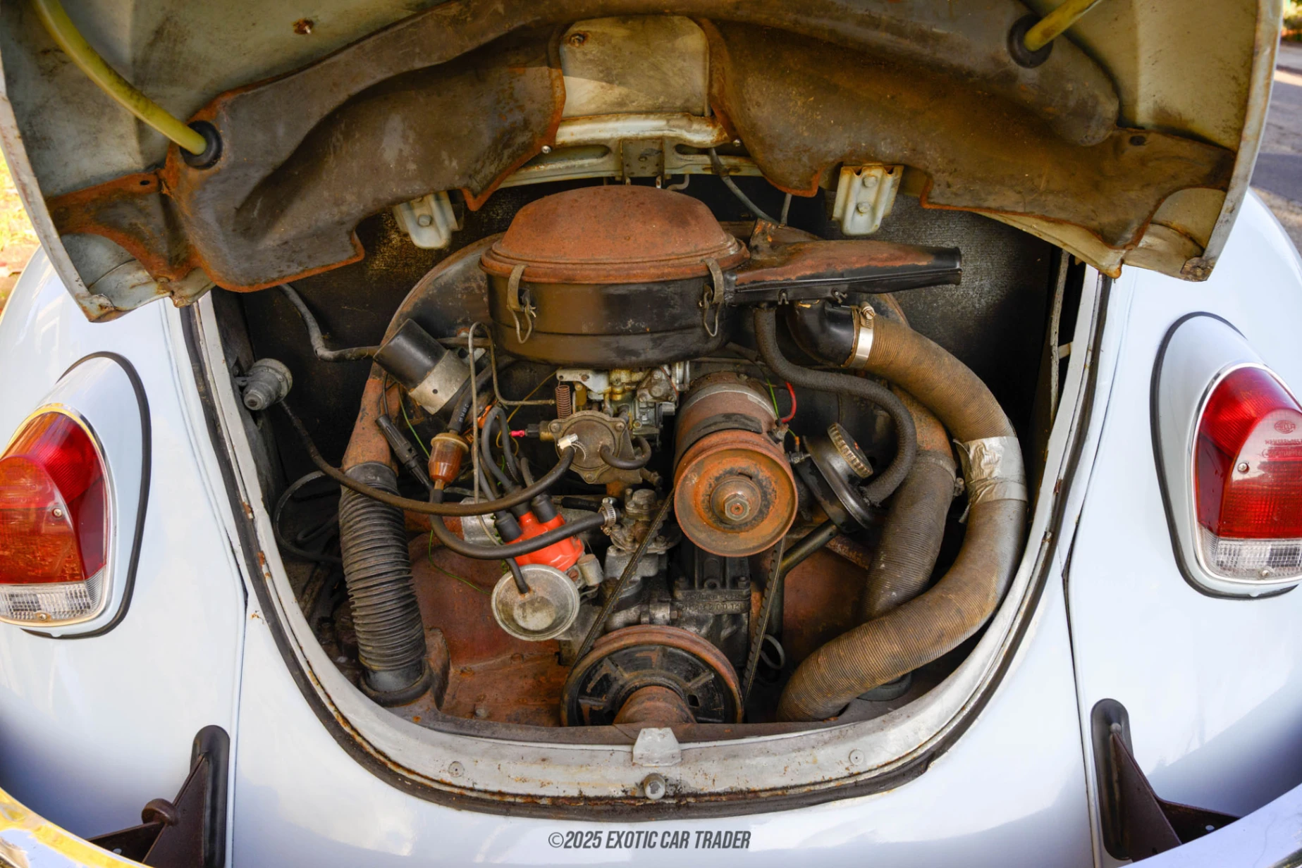 In the rear lies a 1.6L air-cooled flat-four, running a single-barrel Solex carburetor and manual choke. Known for its reliability and simplicity, the engine is mated to a 4-speed manual transmission that delivers a true analog driving feel. The rear-mounted layout offers unique weight distribution, while the torsion-bar suspension provides a soft, floaty ride consistent with vintage Volkswagens. This example features upgradd front disc brakes. The engine bay remains largely stock, with visible signs of age and authenticity, including the original generator setup, oil bath air cleaner, and mechanical fuel pump.