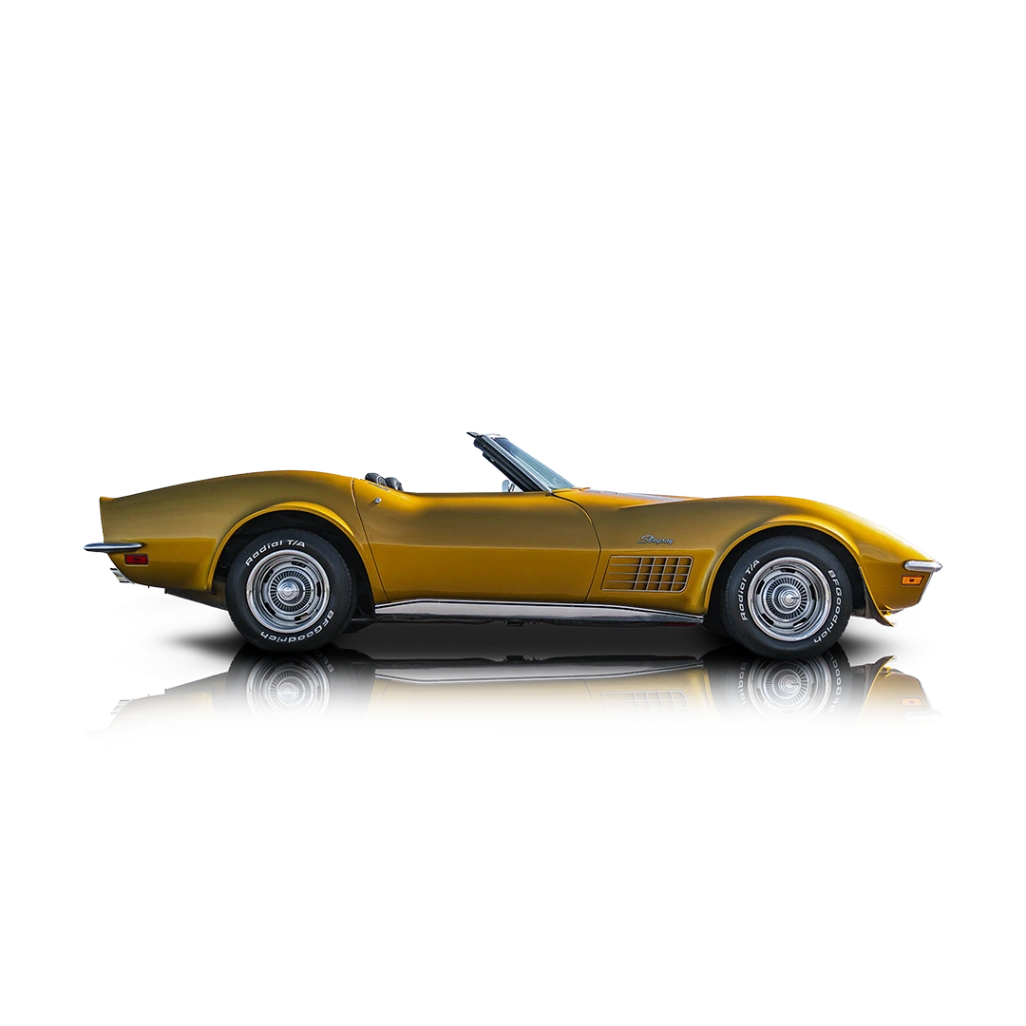 The exterior of this 1971 Chevrolet Corvette Convertible is finished in LeMans Yellow and retains the desirable early C3 chrome-bumper configuration. Documentation shows professional chrome plating work completed on the front grille components and bumper guards, supporting the refreshed presentation of the front end. An aftermarket center grille and aftermarket bumper guards are fitted, contributing to a clean and cohesive appearance while preserving period-correct styling. The black convertible soft top complements the exterior color and maintains the classic open-air Corvette profile. Inside, the cabin is finished in black and reflects a combination of originality and thoughtful updates. Service records indicate replacement of door panel felts, door felts, wiper door actuator components, and related hardware, addressing common wear areas and improving overall fit and function. A Pioneer head unit has been installed, adding modern audio capability while remaining visually unobtrusive within the original dash layout. The interior presents as well-kept and functional, consistent with a partial restoration approach focused on usability and presentation.