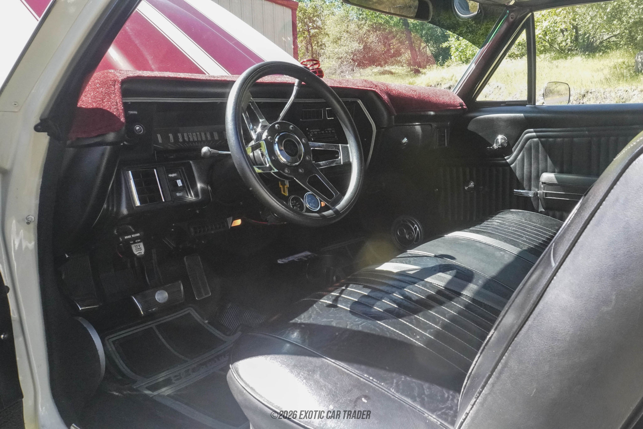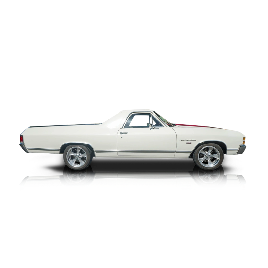 The exterior of this 1971 Chevrolet El Camino is finished in Antique White, complemented by unique Rosewood Poly/Metallic stripes that add a subtle yet stylish contrast. Its long hood and integrated bed design give it a distinctive profile that sets it apart from traditional muscle cars. Aftermarket wheels enhance its stance, while the clean body lines and chrome accents maintain its classic appeal. The combination of vintage styling and light customization makes this El Camino both eye-catching and timeless. The interior of this 1971 Chevrolet El Camino features a clean black cabin that stays true to its roots while offering a comfortable and functional layout. The dashboard design is simple and driver-focused, with easy-to-read gauges and straightforward controls. The cabin provides a practical environment suited for both cruising and light-duty use, reflecting the El Camino’s dual-purpose nature. Overall, the interior complements the vehicle’s exterior with a balance of classic style and everyday usability.