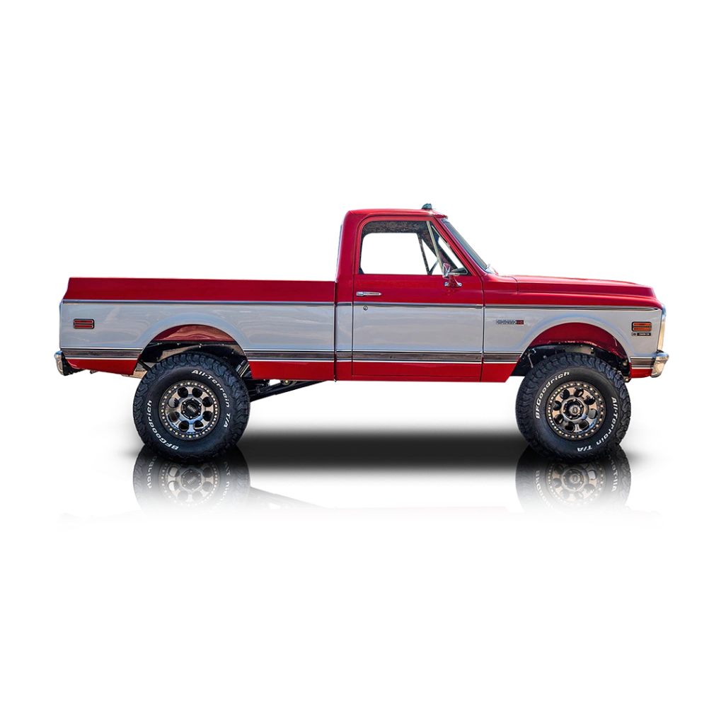 The exterior of this 1971 Chevrolet K10 Pickup is finished in striking GM Super Red and Linen White, separated by correct MAR-K trim for a clean, factory-inspired presentation. Custom Dan Hagan wood grain trim accents the lower moldings and tailgate band, perfectly complementing the beautifully finished wood bed. Additional enhancements include smoked glass, LED-upgraded cab lights with smoked lenses, and refined details throughout that elevate the truck’s presence. Sitting on KMC Riot 17x9 beadlock wheels wrapped in aggressive 35-inch BFGoodrich KO2 tires, and supported by a 5-inch lift with Bilstein shocks and dual steering stabilizers, this K10 delivers both show-stopping looks and serious off-road capability. The interior of this 1971 Chevrolet K10 Pickup has been fully customized with a blend of vintage style and modern comfort. TMI door panels and a custom ergonomic bench seat feature distinctive plaid inserts, tying into the truck’s classic aesthetic while offering improved comfort. Modern conveniences include a tilt steering column, digital gauges, and a Bluetooth-enabled stereo system, making this truck enjoyable for today’s driving standards. AMP Research automatic side steps add both functionality and ease of access, completing a thoughtfully designed cabin that balances classic charm with modern usability.