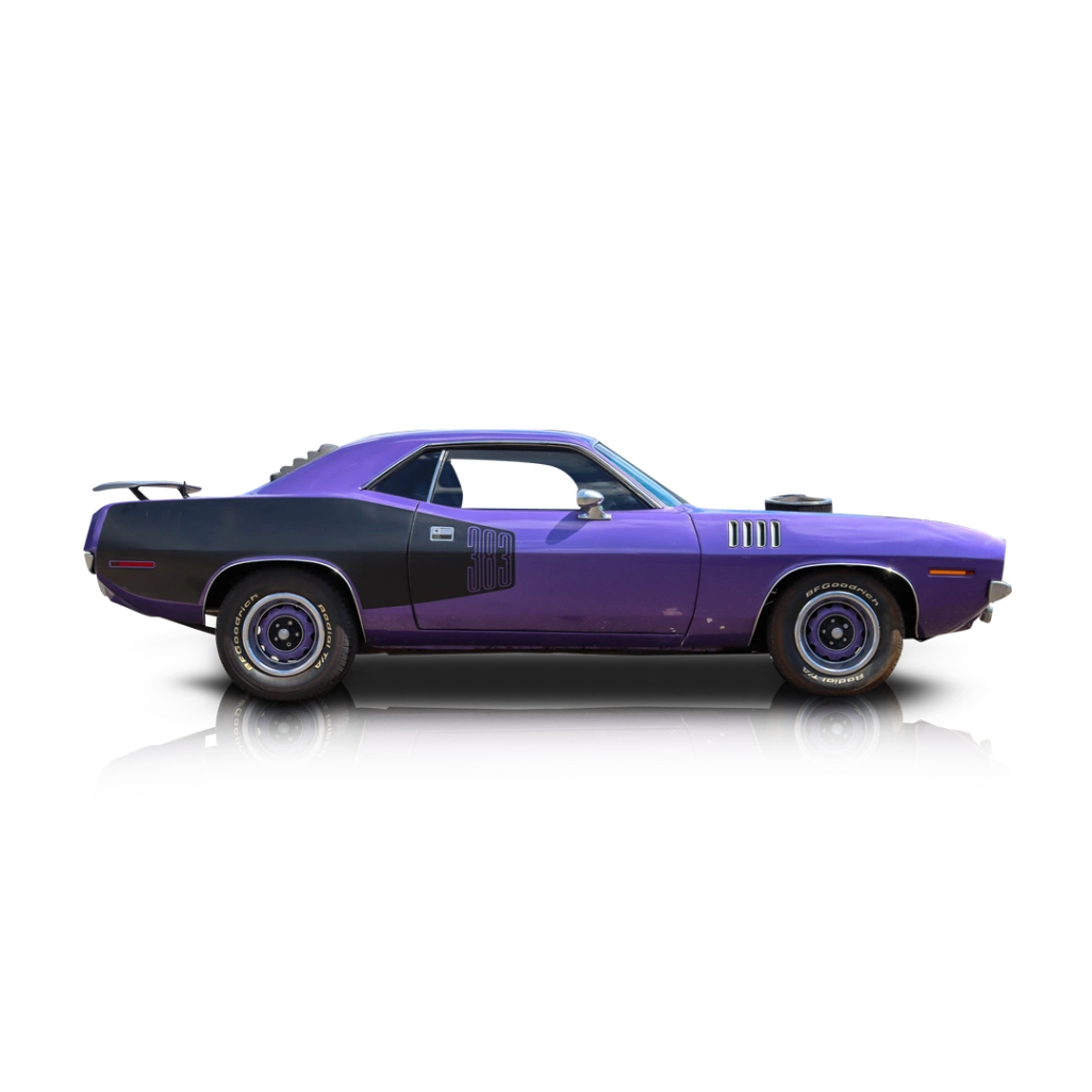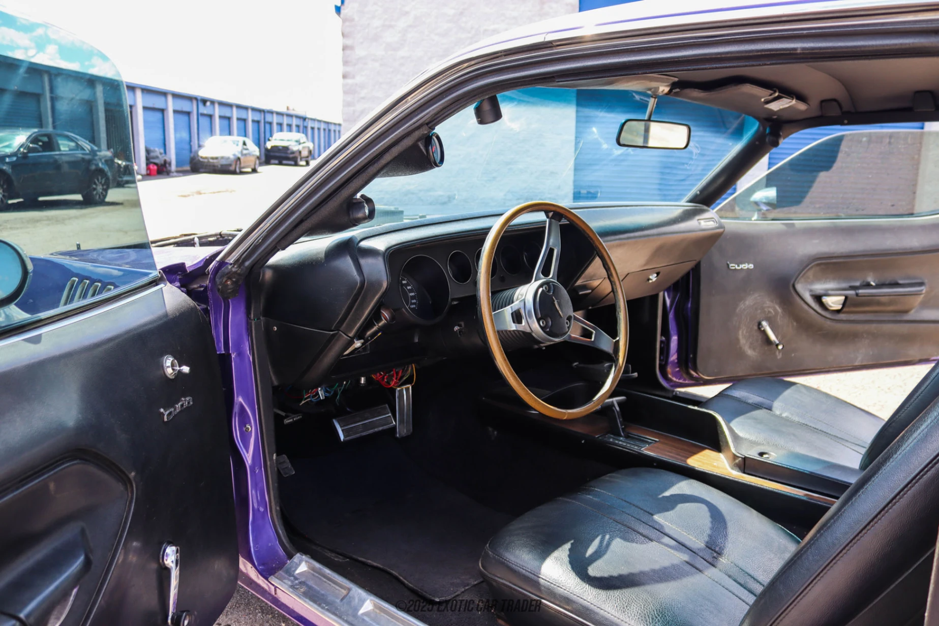 This 1971 Plymouth Barracuda showcases how its two-tone purple and black exterior works well with the sleek and aggressive styling of true muscle car perfection. A look around the exterior and you would find this Cuda’s unique features, which include a rear spoiler, LED lights, and an aftermarket transparent hood that gives you a peek into this car's performance. Looking to get it back to factory? The current owner reports the original hood is included in the sale. For shoes, this '60s beauty sits on a set of steel wheels, which are finished off in purple - a feature only a Plymouth Barracuda can pull off. The 60s charm spreads to the black interior of this 1971 Plymouth Barracuda as well. Step inside and you would find an interior cabin that is mostly factory clean with the exception of tasteful upgrades. Look around and you would find side-mounted gauges showcasing this car's performance, a wooden steering wheel, and an aftermarket sound system to bring those 70s tunes to life.