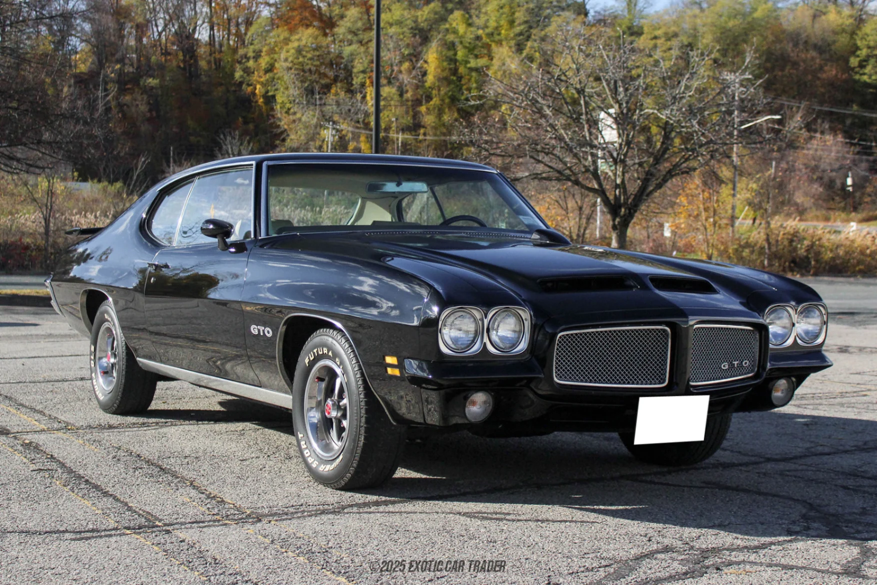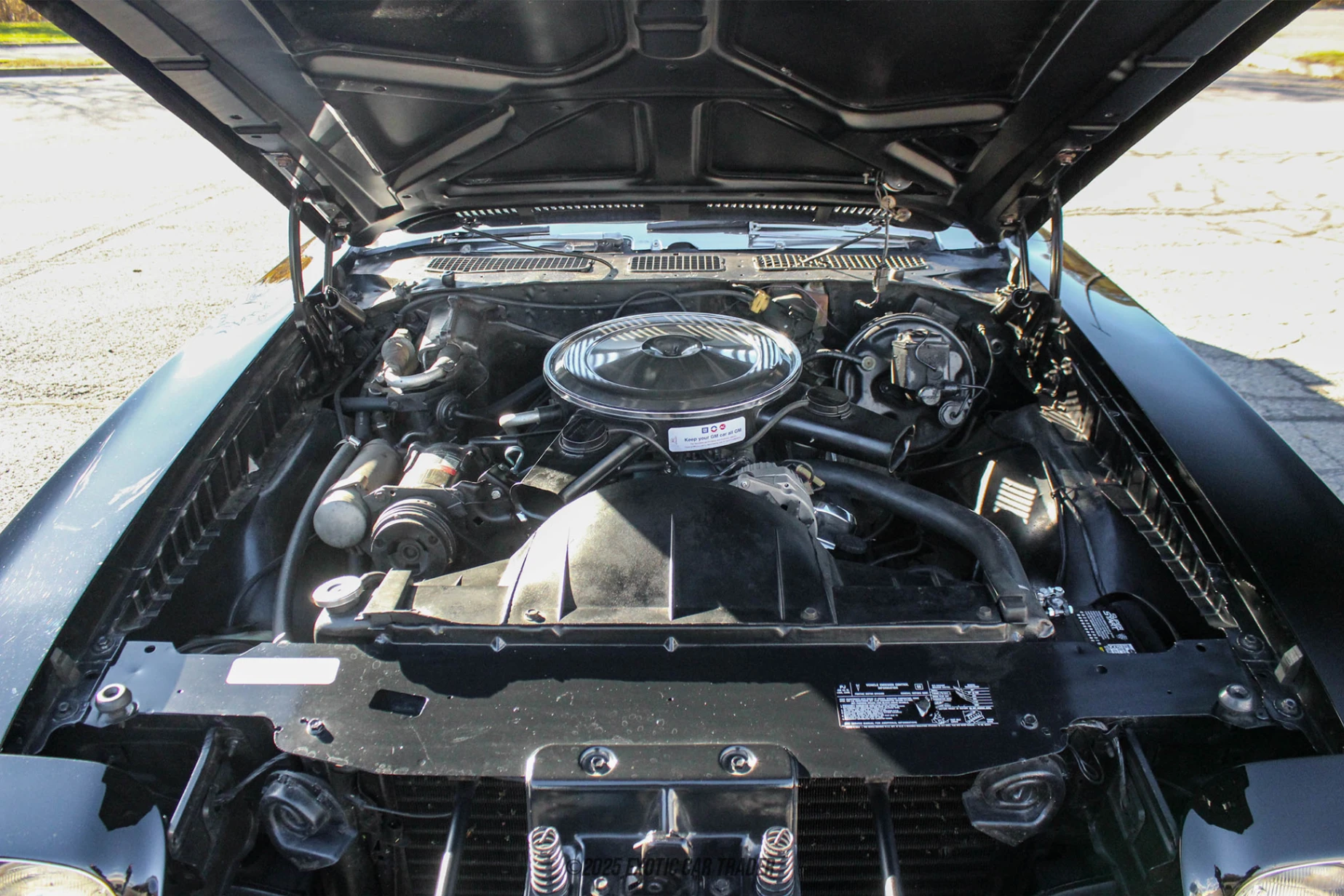 Dressed in Starlight Black, this 1971 Pontiac GTO features the iconic PMD (Pontiac Motor Division) Rally II wheels with Futura GLS Super Sport white-lettered tires. Long, low and sleek, with double headlamps per side and a rear deck lid spoiler, this is definitely a racer, no question about it. Imagine buying this car brand-new way back in 1971 – you would have felt like a million bucks! The interior of this 1971 Pontiac GTO features factory air conditioning which Is really nice, as well as the factory Pontiac 2-spoke steering wheel. Overall, it’s been preserved in stock form to a great degree. The only upgrade visible is the aftermarket Pioneer radio with cassette deck. There’s some lovely Ivory colored seating waiting to host a driver and three passengers, plus some wood trim on the dashboard. Plus, this car has got the iconic hood-mounted tachometer that stares at the driver through the windshield. Pop the trunk and there’s enough cargo space, plus a spare wheel.