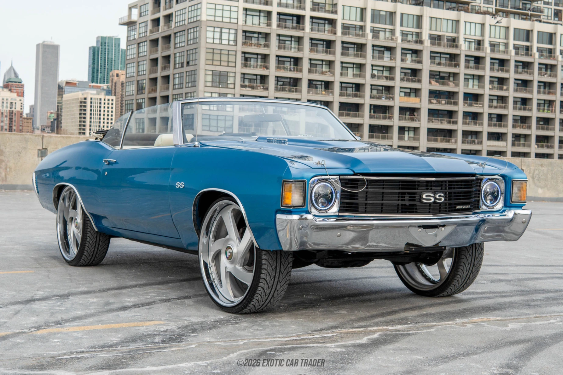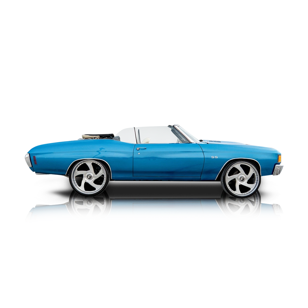 The Mulsanne Blue exterior gives the car a rich, period-correct presence, contrasted nicely by the white interior and white soft top. While originally a Malibu, the addition of SS badging gives it a more aggressive visual identity. Modern LED halo headlights update the front-end appearance, and large aftermarket Forgiato wheels significantly change the stance compared to the factory setup. Inside, the cabin maintains classic 1972 Chevrolet styling cues but incorporates modern upgrades including a Forgiato steering wheel, Pioneer head unit, and an upgraded sound system. The result is a classic convertible with contemporary visual impact.