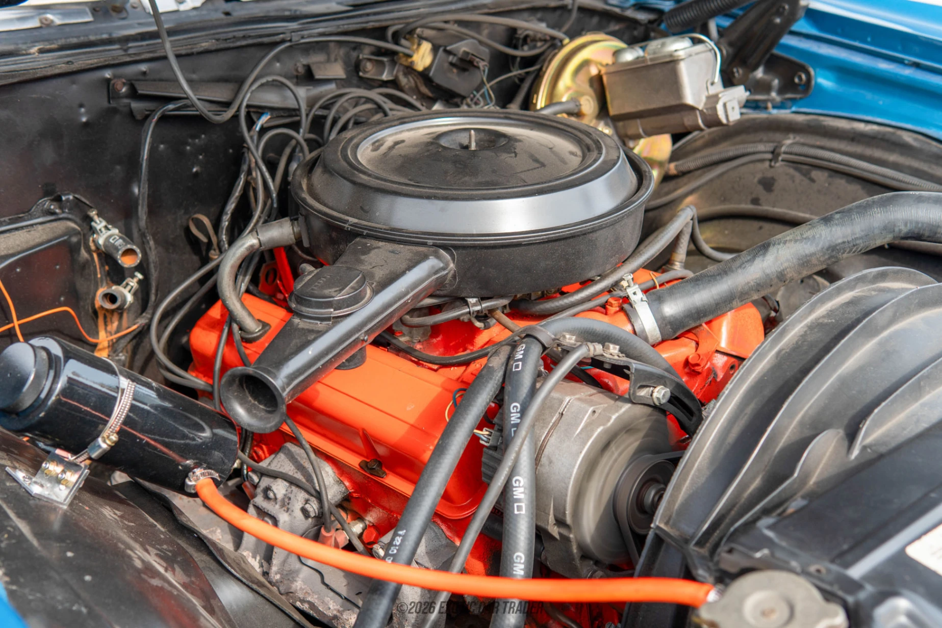 The 350ci L48 small-block V8 remains naturally aspirated and carbureted, maintaining traditional small-block Chevrolet character. The Turbo-Hydramatic 3-speed automatic provides smooth cruising, while the factory G80 Positraction rear axle with GU4 3.08 gearing offers a balanced combination of acceleration and highway comfort. Power steering and power front disc brakes enhance drivability. An aftermarket suspension setup and oversized wheels give the car a lowered, pro-touring style stance, transforming it from a stock Malibu convertible into a modernized classic cruiser.