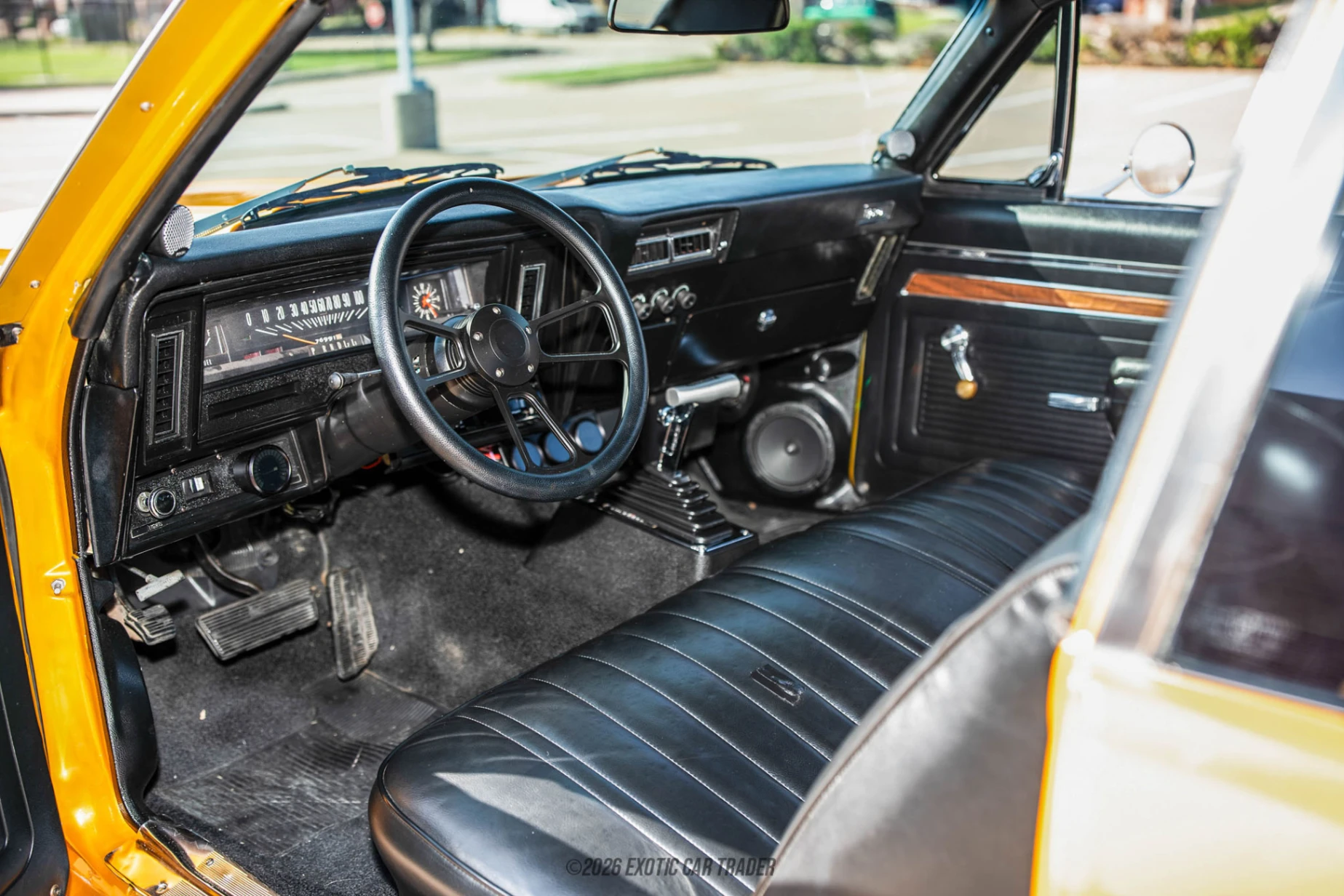 The exterior of this 1972 Chevrolet Nova is finished in Burnt Orange, a color that complements the Nova’s compact muscle car proportions and aggressive stance. A cowl induction hood and TrackSpec hood louvers give the car a purposeful look while also helping improve engine bay ventilation. The car rides on REV 109 Classic Magnum 15-inch wheels that evoke the classic muscle car aesthetic while maintaining a period-correct appearance. Additional upgrades include Digi-Tails LED tail lights for improved visibility and an aftermarket 2.5-inch exhaust system with Flowmaster mufflers and chrome tips, which provide the deep, unmistakable sound expected from a big-block Nova. The interior of this 1972 Chevrolet Nova features a black cabin that balances classic styling with several modern upgrades for improved functionality. A Hurst V-Matic 3 floor shifter provides a performance-oriented driving feel while maintaining control over the TH350 automatic transmission. The dashboard is equipped with Intellitronix digital gauges for accurate monitoring of the car’s systems, and a driver-side 4-point racing harness adds an extra measure of safety. Additional amenities include air conditioning and an aftermarket stereo system with a 4-channel amplifier, offering comfort and entertainment while cruising.