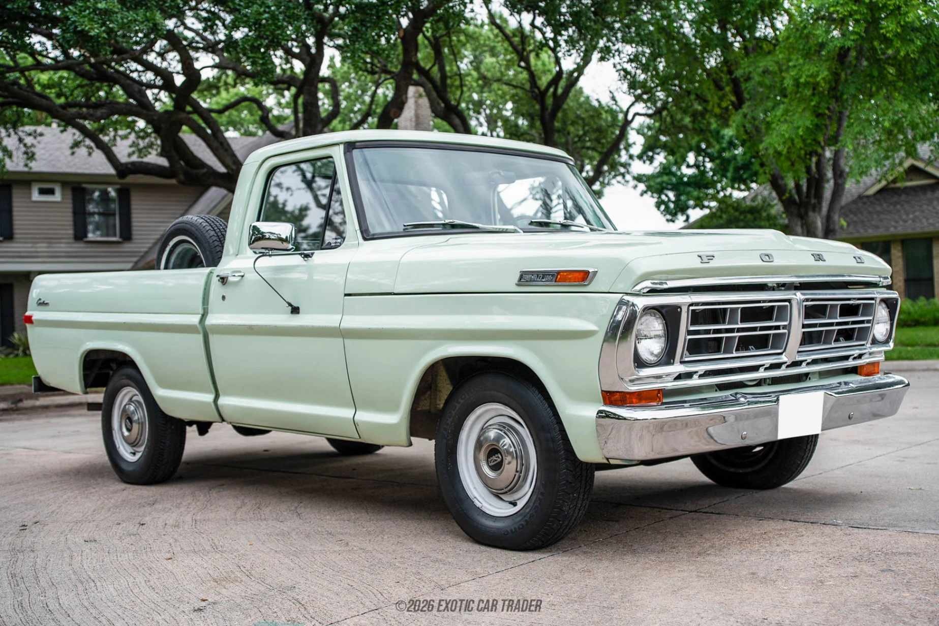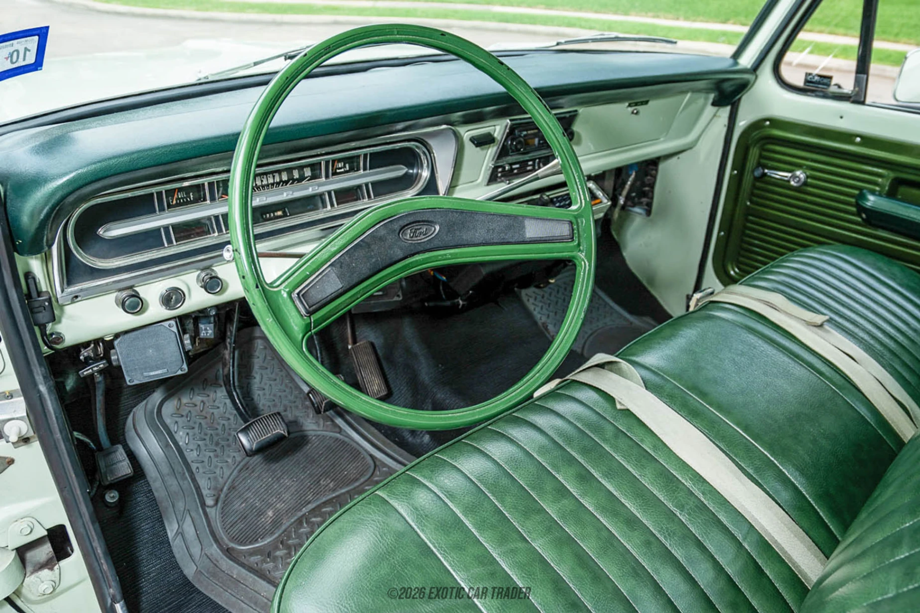 The exterior of this 1972 Ford F-100 Pickup is finished in Winter Green, a period-correct color that perfectly suits the truck’s clean, boxy styling. The custom paint job in its original color preserves its factory identity while giving it a refreshed and well-kept appearance. Signature design elements such as the wide front grille, simple body lines, and utilitarian bed highlight the F-100’s purpose-built nature. Its stance and proportions reflect an era when trucks were designed with both work and straightforward style in mind, making it a standout among classic American pickups. The interior of this 1972 Ford F-100 Pickup is finished in green vinyl, maintaining a cohesive and era-appropriate look. The cabin is simple and functional, with a focus on durability and ease of use. A notable upgrade is the aftermarket head unit, offering improved audio capability over the original setup. As seen, the truck also features an under-dash air conditioning unit, a popular period add-on that enhances comfort while retaining a vintage feel. Overall, the interior reflects the honest, no-frills design philosophy of early ‘70s trucks while incorporating subtle usability improvements.