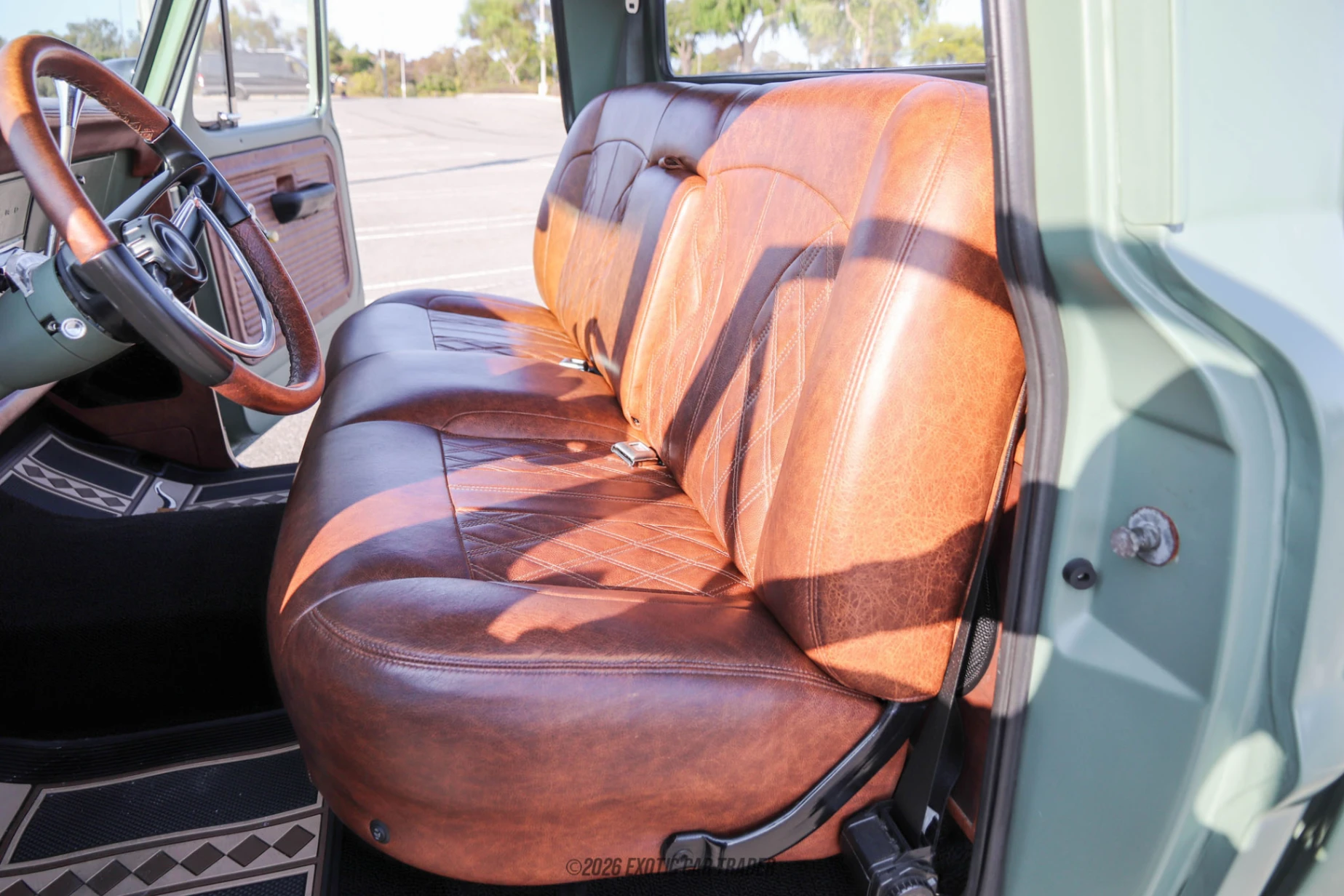 This F-100 stands out with a reportedly custom paint job in Olive Green, and also features black bumpers and trim pieces, LED headlights, and integrated off-road lighting. The truck features a long and capacious truck bed, while it also sits on lifted suspension with Fox shocks. The stance is further complemented by aftermarket wheels, which are wrapped in Cooper Discoverer AT3 tires, adding capability and an aggressive stance. Inside, the cabin has been completely re-imagined — it’s no longer a spartan affair, but screams luxury with diamond-stitched brown leather upholstery, a cowhide headliner, and a retro-style stereo head unit that blends vintage looks with modern functionality. Last but not least, you’ll find air conditioning to keep you cool.The interior of this classic 1972 Ford F-100 comes in brown, with low-back seating and a nice dashboard to gaze at. A closer look reveals some useful upgrades, such as a retro-modern styled radio, and a heating plus air conditioning system! It’s all beautifully integrated into the dashboard, with minimal disturbance to not break the classic aura of this truck. Even its original style gauge cluster is largely retained, with some discrete digital gauges incorporated within.