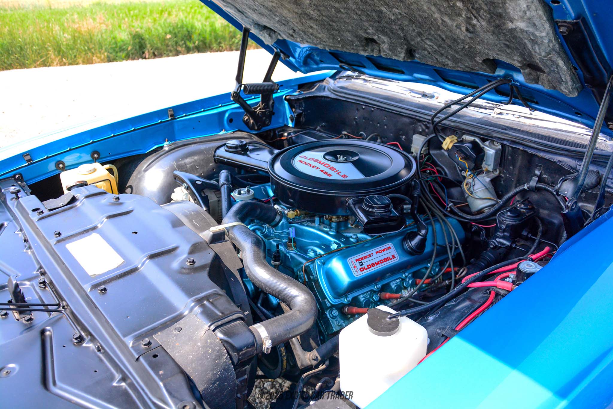 This 1972 Oldsmobile Cutlass wears a lovely shade of blue paint, and shows off its quad headlamps and ample chrome trim with pride. The car’s silver and black wheels gel well with its white-lettered BF Goodrich tires, granting it that classic Seventies vibe. Nothing really betrays what’s under the hood of this car, as it looks classic Cutlass from outside. The rear bumper is a fully chromed affair and was quite breathtaking at the time, as it incorporates the rear lamps within its structure. There’s discrete 442 badging as the only calling card of potency. The interior of this 1972 Oldsmobile Cutlass features bench seating that has been reupholstered in blue vinyl. It’s quite an interesting place to be, with its wood-trimmed dashboard, four-spoke steering wheel and slider controls for the heater. The original push-button radio is retained, but music is now handled by a Pioneer unit sitting lower down in the center console. As for the trunk, it’s in equally great condition and hosts a full-size spare wheel and tire.