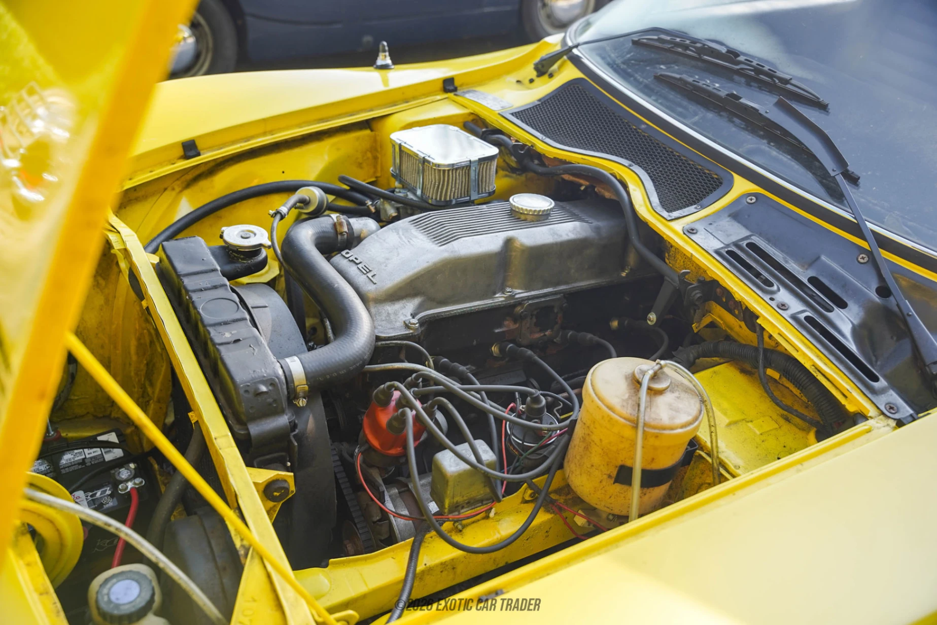 This 1972 Opel GT packs a 1.9-liter four-cylinder engine. The cam-in-head unit uses a single Solex caburetor. It’s paired with a 4-speed manual transmission and the car is rear-wheel drive. You’ve got worm and roller steering, front disc brakes and rear drum brakes. There’s a rear rigid axle suspension with coil springs, while the front uses an independent double wishbone set-up.